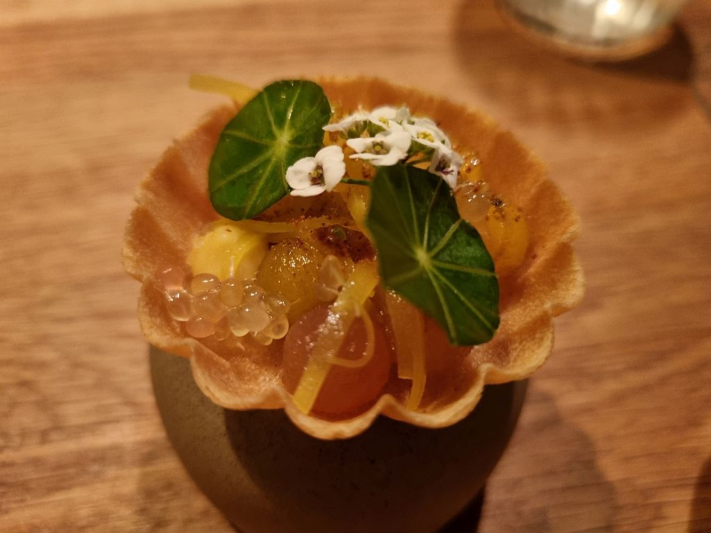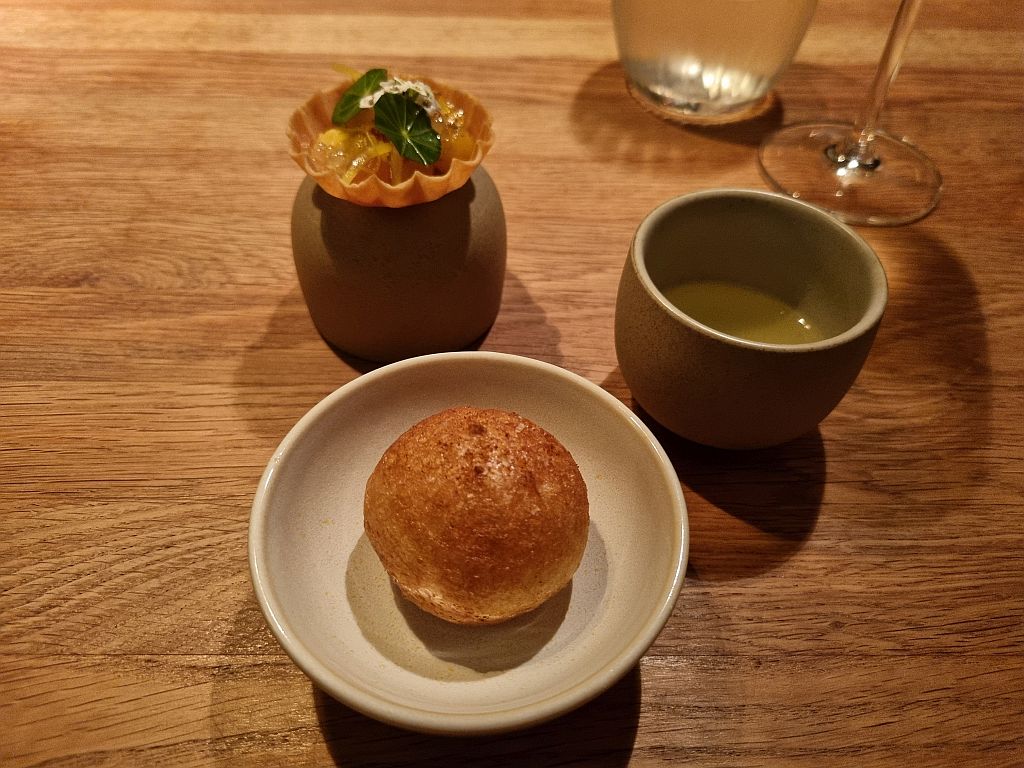 Bevor über die Anzahl der Gänge entschieden wurde, gab es bereits die ersten Grüße aus der Küche: Ein sehr vollmundiger und fast schon herzhafter Sud aus gelber Beete, ein Tartelette mit gelber Beete, Apfel Vadouvan und Saiblingsrogen. Und ein „Berliner, Krapfen, Krebbel, Sonstwas“ mit einer herzhaften Füllung.