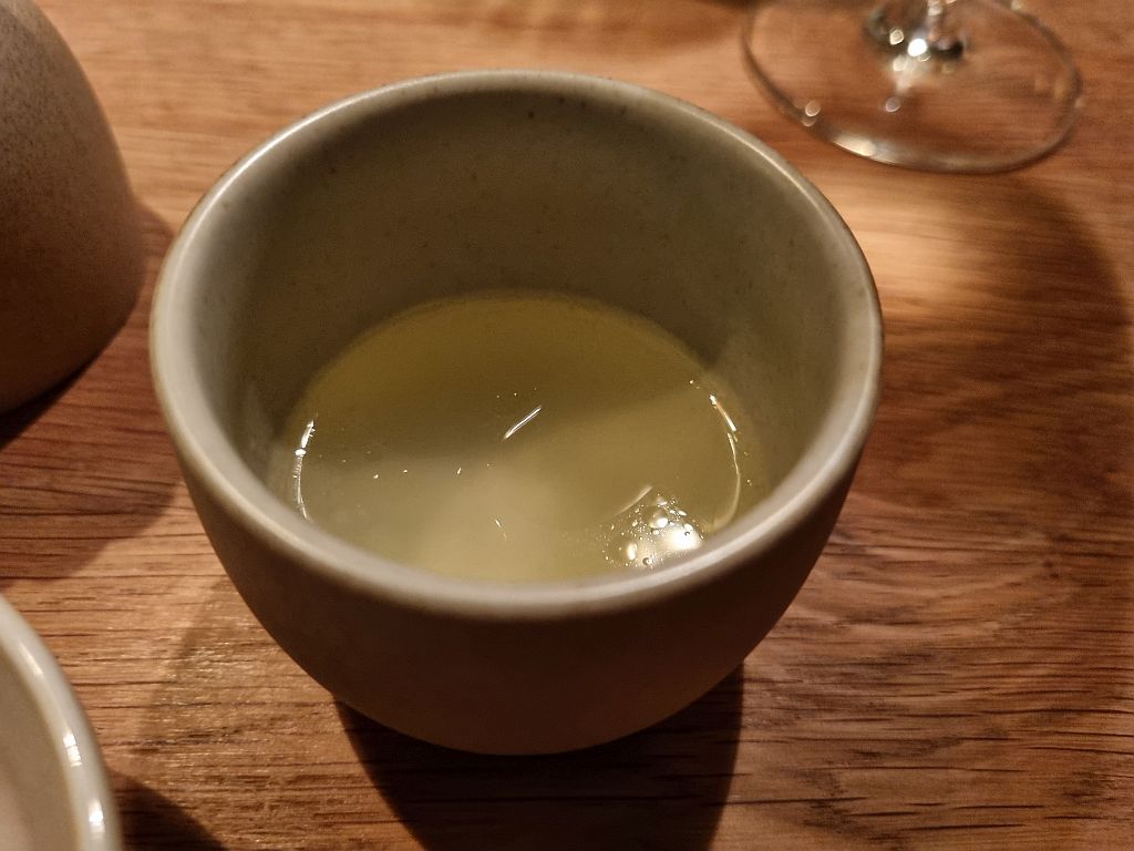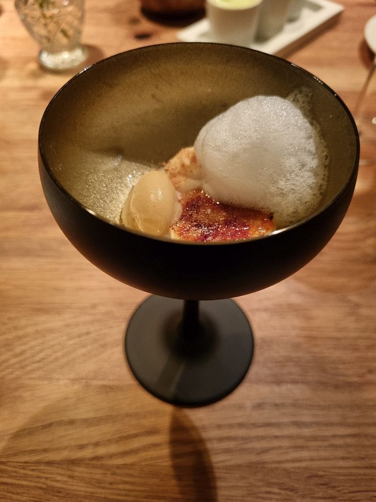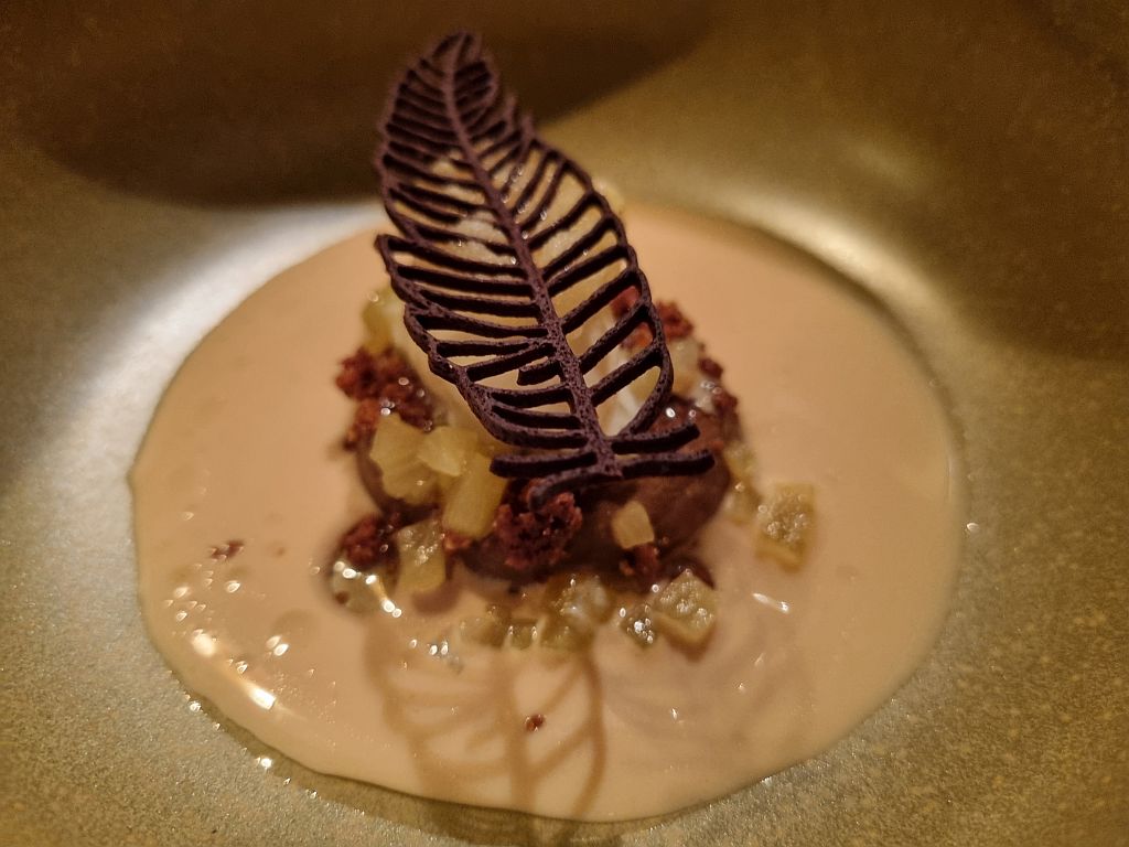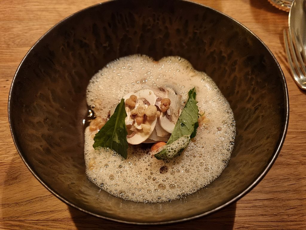 Na gut, Nutella war es nicht, aber Kakao mit Haselnuss. Dazu, etwas komisch am Anfang, schwarzer Knoblauch. Die Topinambur war etwas groß, aber gut gegrillt. Die Pilze waren … da und kleine Backerbsen rundeten das Geschmacksbild ab. Naja, eher die Textur, denn geschmacklich war der Schaum schon sehr überwältigend.