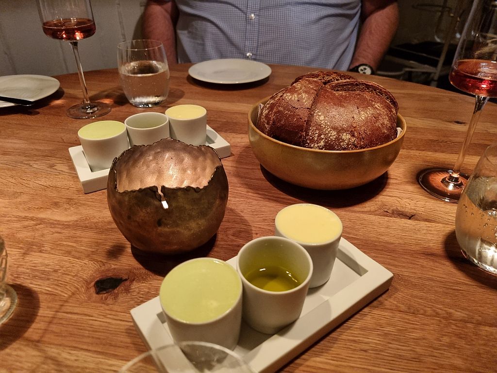 Sauerteig-Brot, Rapsöl-Aufstrich, eine Creme aus Brunnenkresse und Olivenöl folgten dann und wurden gerne verkostet.