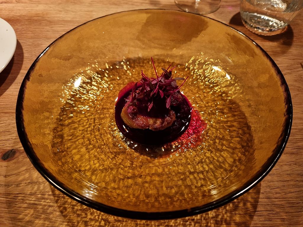 Dadurch, dass die Rote Beete, der Rotkohl Kimchi und die Senffrüchte miteinander verschmolzen, war das einfach wieder ein sehr vollmundiger Gang. Die Leber passte hervorragend zu den roten Aromen und der leichten Schärfe vom Kimchi.
