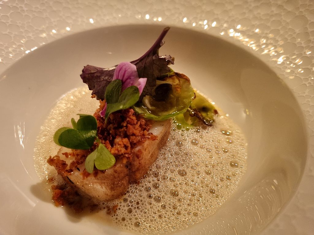 Als nächstes im Menü: Seeteufel mit Rosenkohl, einer Velouté aus Haferwurzel (also einer Mehlschwitze mit einem Fond gesimmert) sowie sehr krosser Hühnerhaut.