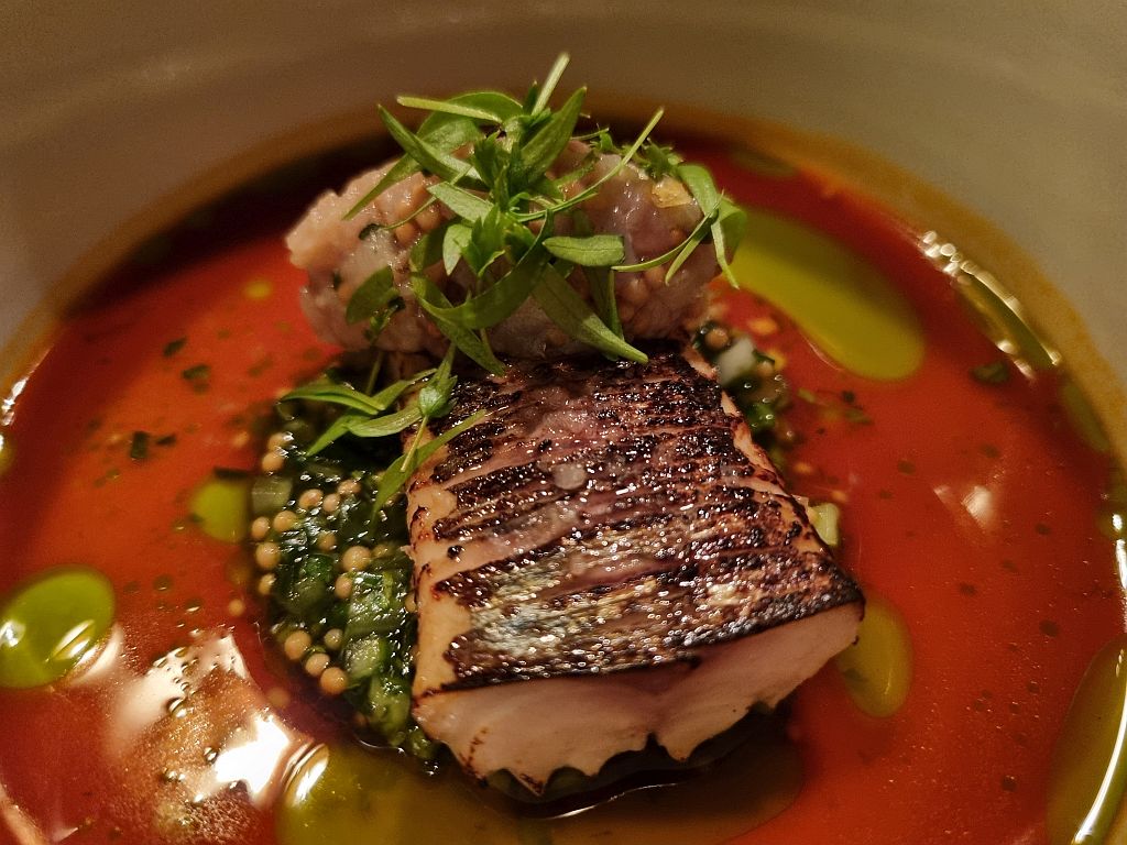 Meike, Jan und Jens bekamen eine Makrele „Bloody Mary“ und das war eine sehr intensive Kombination aus einer geflämmten Makrele mit einem würzigen Dashi, Sellerie und Senfkörner sowie Lorbeeröl. Dazu noch eine Nocke Makrelentartar drauf.