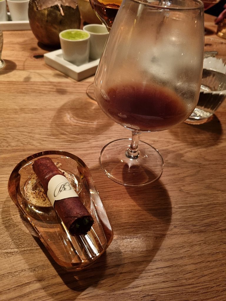 Da das hier aber ja eher kulinarisch zu sehen ist und ansonsten auch der Raum jede Woche vermutlich neu gestrichen werden würde, wurde hier nur die Präsentation nachgestellt. Im Detail hatten wir hier eine Consommé aus Ochsenschwanz im Glas sowie quasi „Pulled Ochsenschwanz“ in der Zigarre, deren „Papier“ in der Flüssigkeit des Inhalts getränkt wurde. Dazu, symbolisch für die Asche, ein getrocknetes Pulver aus Apfel und Wermuth.