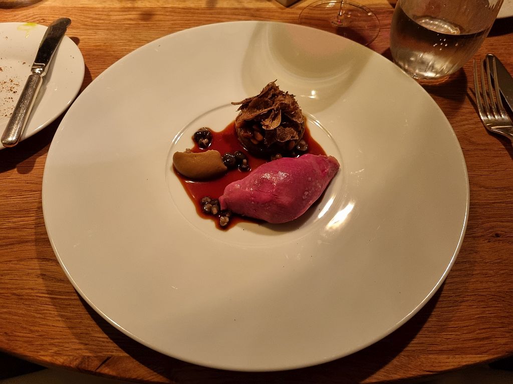 Die Taube sah spannend aus, hatte aber beispielsweise bei Jens noch ein paar Sehnen. Dazu gab es ein sehr gutes Regout aus der Taube, geschmorten Wirsing und Herbsttrüffel. Hier war es wieder so, dass die Trüffel ab und zu den Geschmack überlagerten und auch die Sauce hier nicht viel gegenzusetzen hatte. Alles sehr gut, keine Frage, aber eben kein Highlight wie der Gang zuvor.