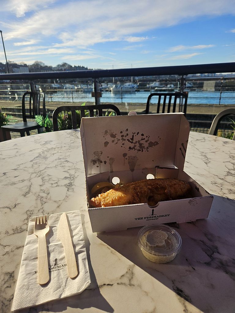 Dort im Fastfoodbereich des Restaurants in dem wir mit Jens Bruder beim letzten Besuch gegessen hatten einmal Fish & Chips bestellt und raus in die Sonne gesetzt.