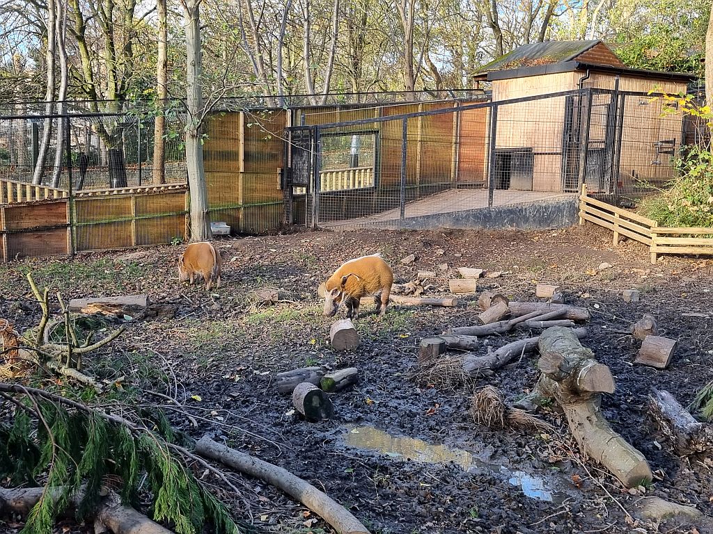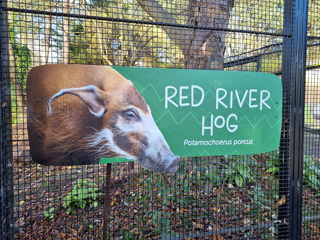 Aber die Pinselohnschweine, auf Englisch Red River Hog genannt, sind jetzt im ehemaligen Flamingo-Gehege direkt daneben.