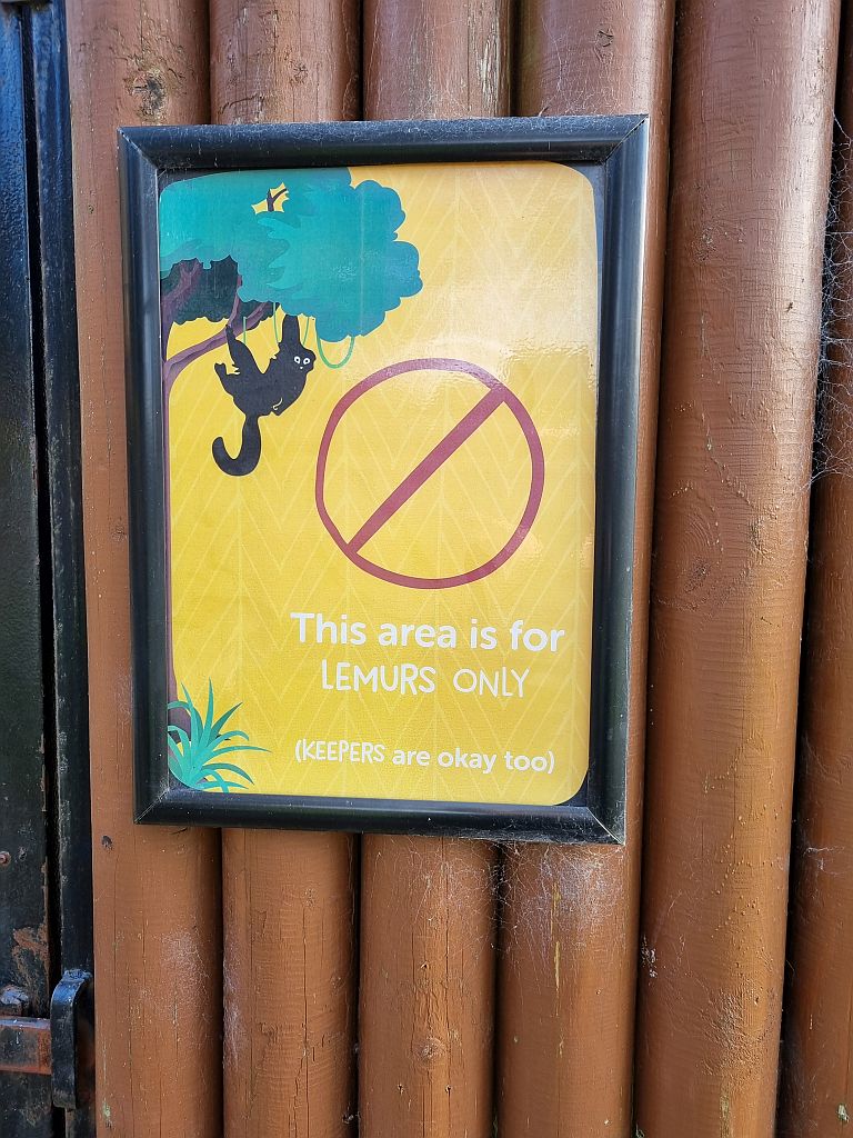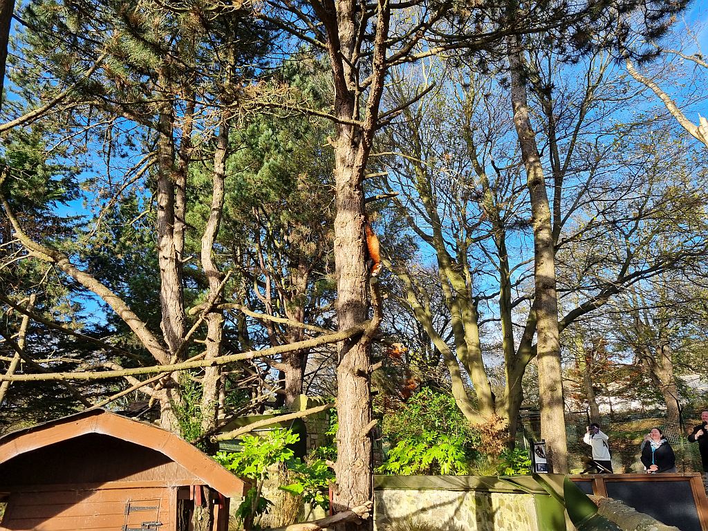 Vom selben Pfleger haben wir dann eine witzige Morgenroutine von Bruce erfahren: So gegen halb 12 kommt er immer von einem Baum runter und … nun … kackt auf das vordere Haus. Dann wird eine Runde beim Essen gedreht und im Anschluss geht er wieder rauf auf einen Baum.