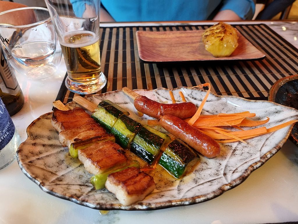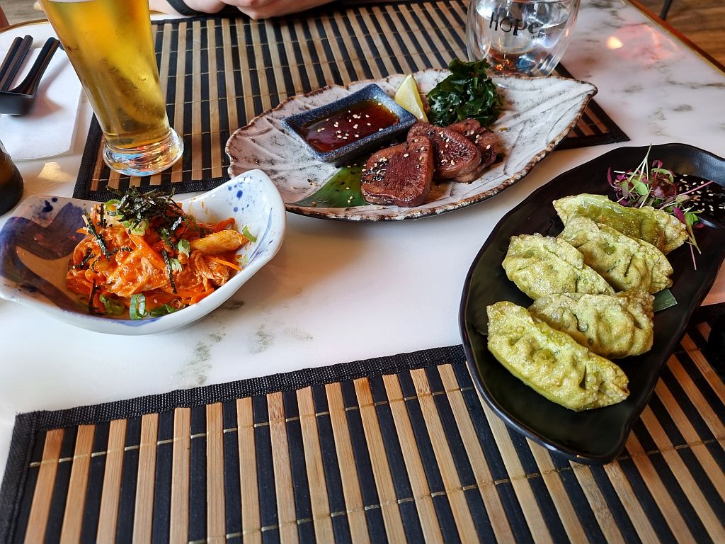 Das Essen war spannend und teilweise sehr gut: Kimchi (jetzt nicht gerade japanisch, passt aber zu Bier und Tee. Dazu Rinderzunge und vegetarische Gyozas.