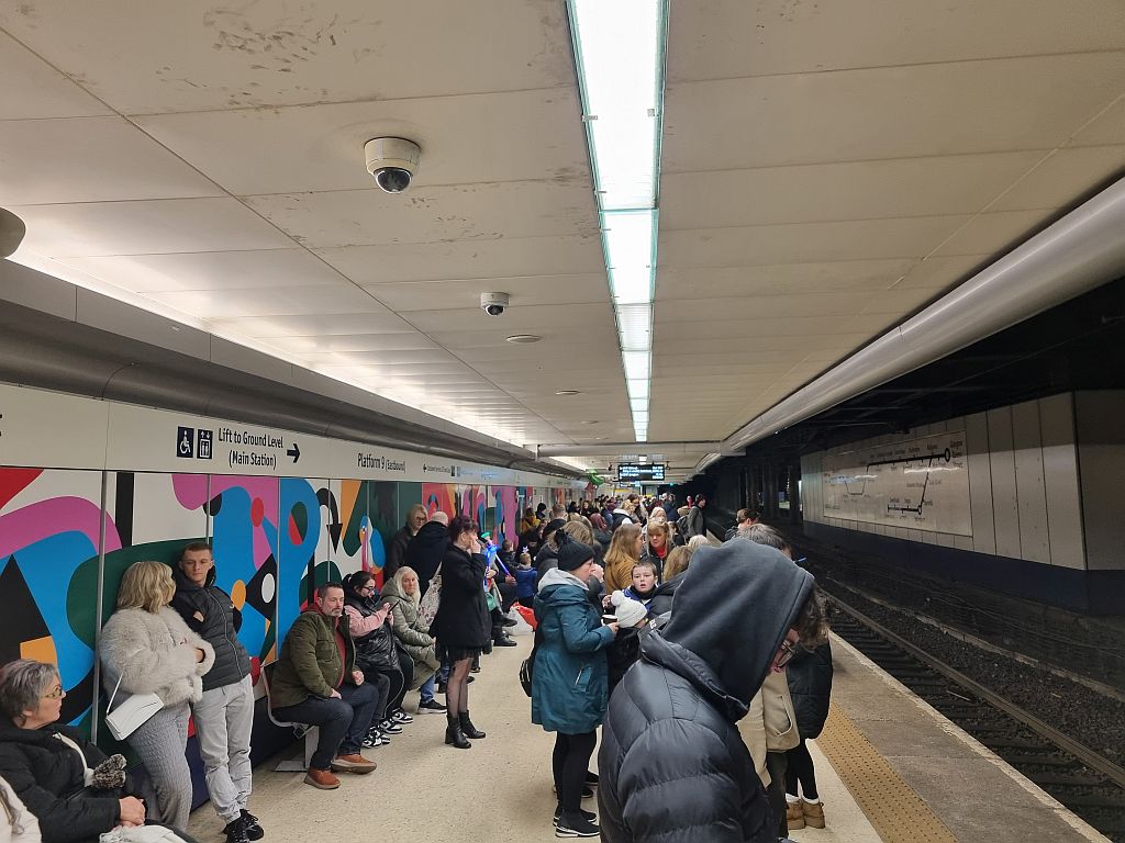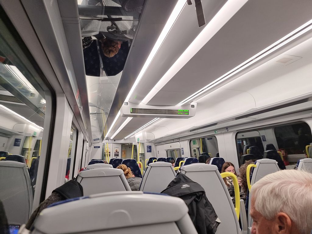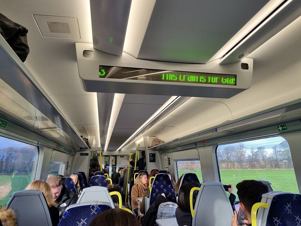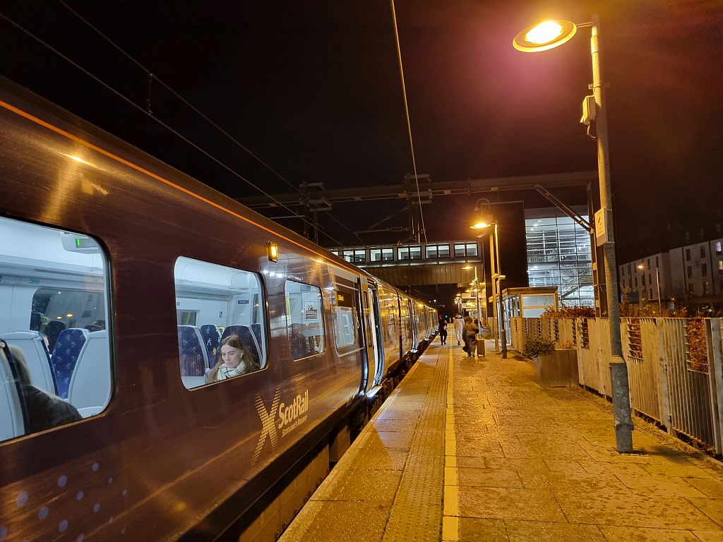 Zurück zum Bahnhof ging es dann relativ schnell. Unser Zug war jetzt der direkt nach Edinburgh Park fahrende Zug. Der allerdings einerseits nicht in Glasgow, sondern in Helensburgh Central weiter westlich beginnt und daher den „Low Level“ Teil der Queen Street Station durchfährt. Und der andererseits auch an jeder schottischen Milchkanne hält und deswegen anscheinend von vielen Tagesausflüglern genommen wird, um nach dem Weihnachtsmarkt oder sonstwas wieder nach Hause zu fahren.