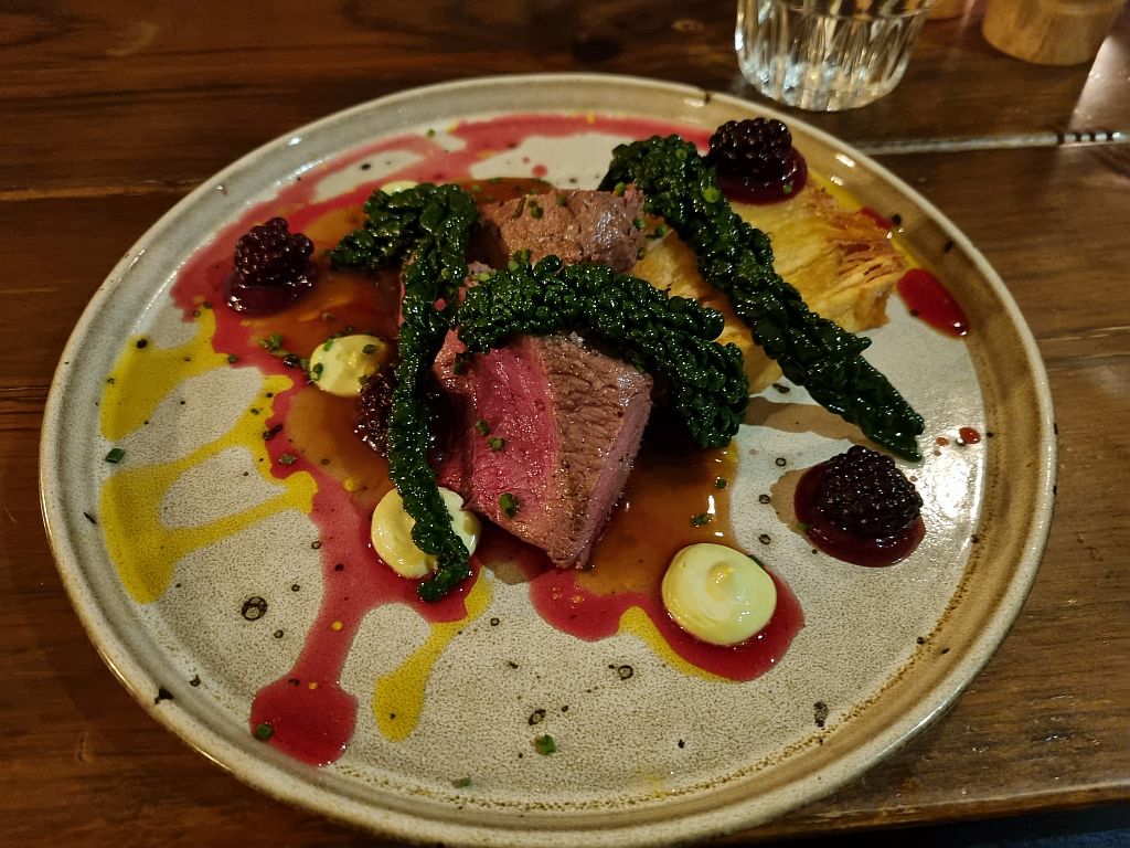 Der Hauptgang war dann aber bei Jens wieder sehr, sehr lecker. Denn es gab Reh Filet mit Beeren, Kartoffeln und Gemüse.
