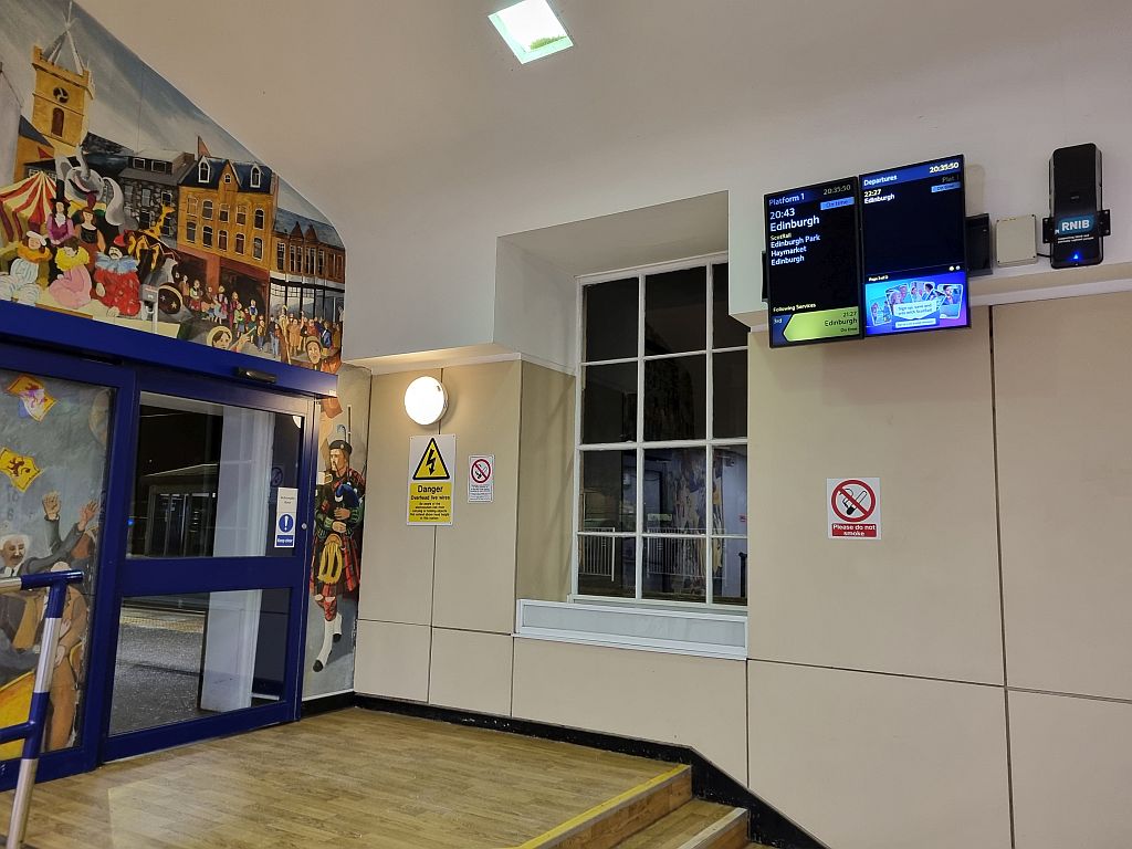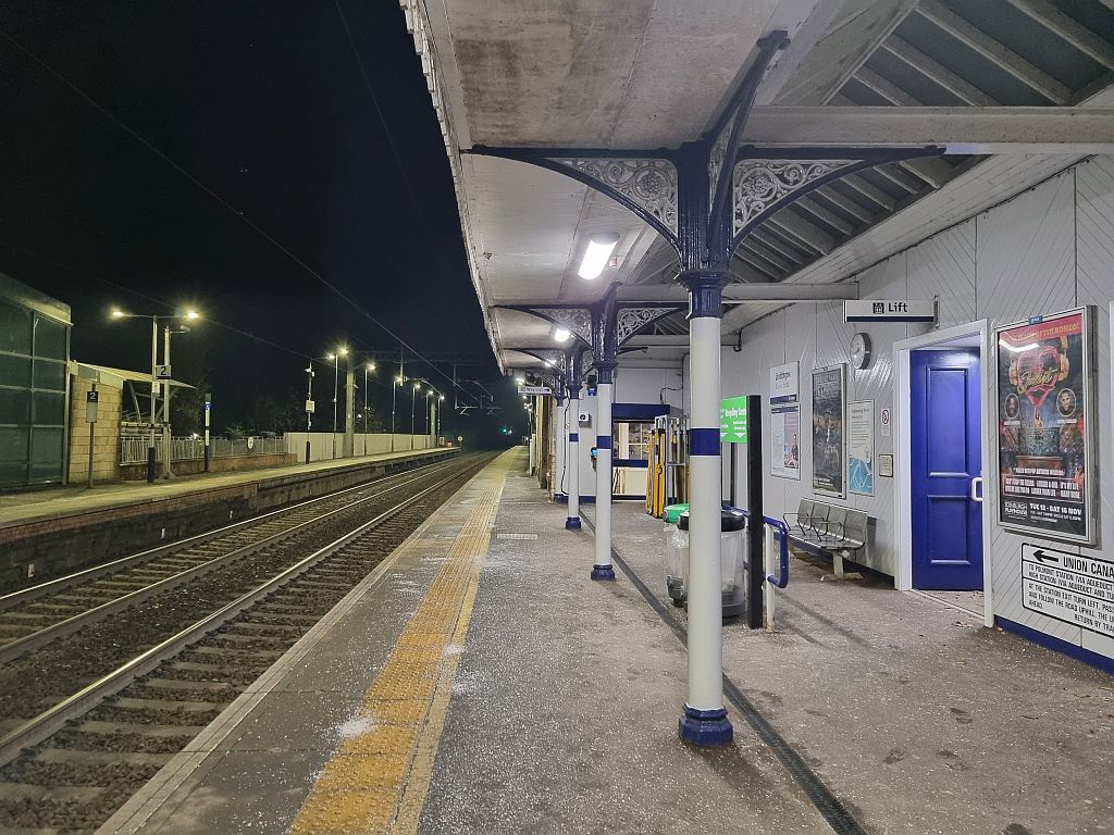 Mit Cola, Schoki und Nüssen ging es durch die Nacht zu unserem Umsteigebahnhof: Linlithgow. Ein kleiner 12.000 Einwohner großer Ort etwa 20 Kilometer vor Edinburgh. Ein schöner Bahnhof, der 1842 eröffnet wurde.