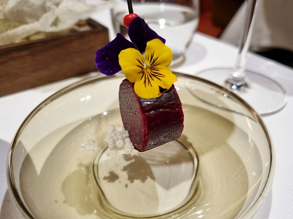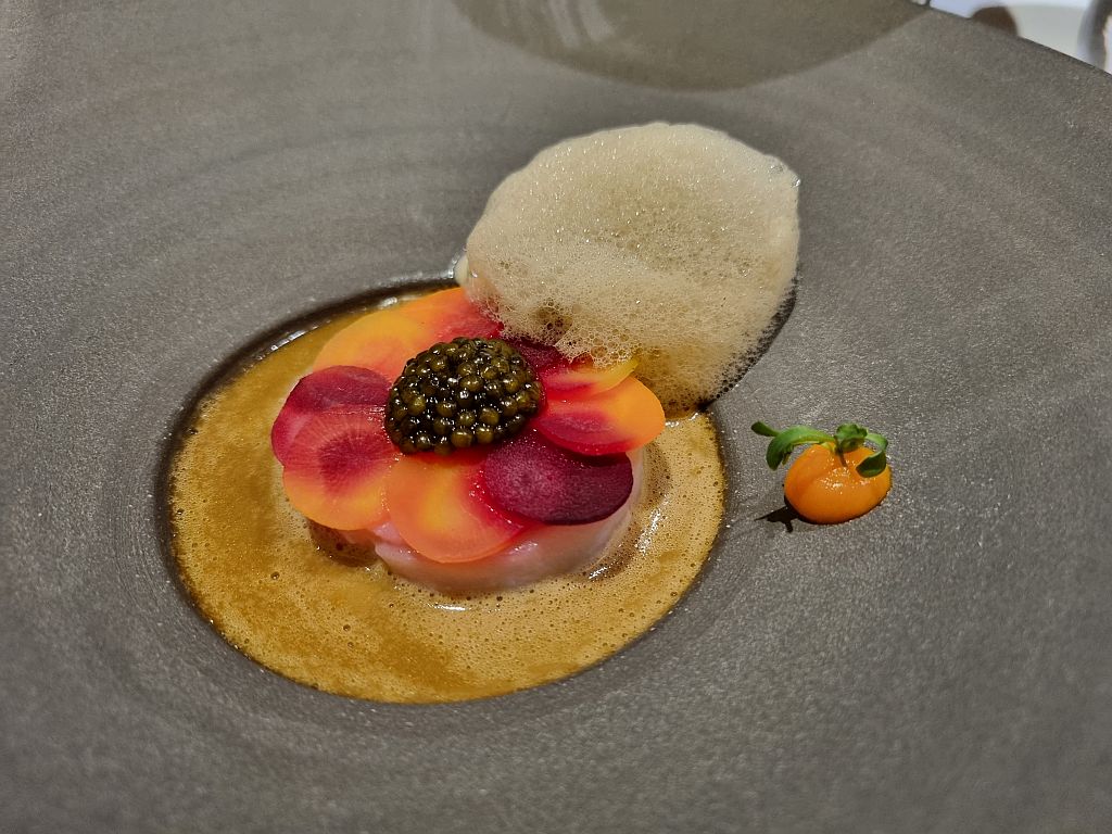 Bei Jens gab es dagegen erneut Kaviar, darunter kleine Beete-Scheiben, Kabeljau und eine Bisque. Etwas wild, aber irgendwie auch lecker.
