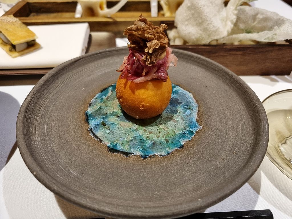Eine überraschend feste Kartoffel-Praline mit Wagyu und Trüffel.