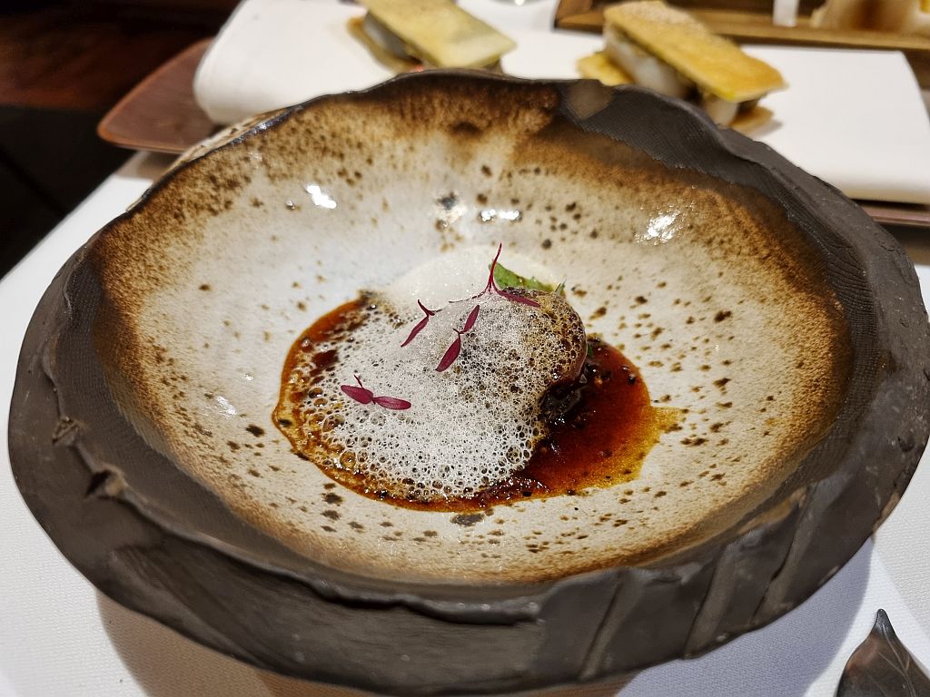 Eine Scheibe geschmortes Wagyu mit einer unglaublich kräftigen Sauce und Schaum.