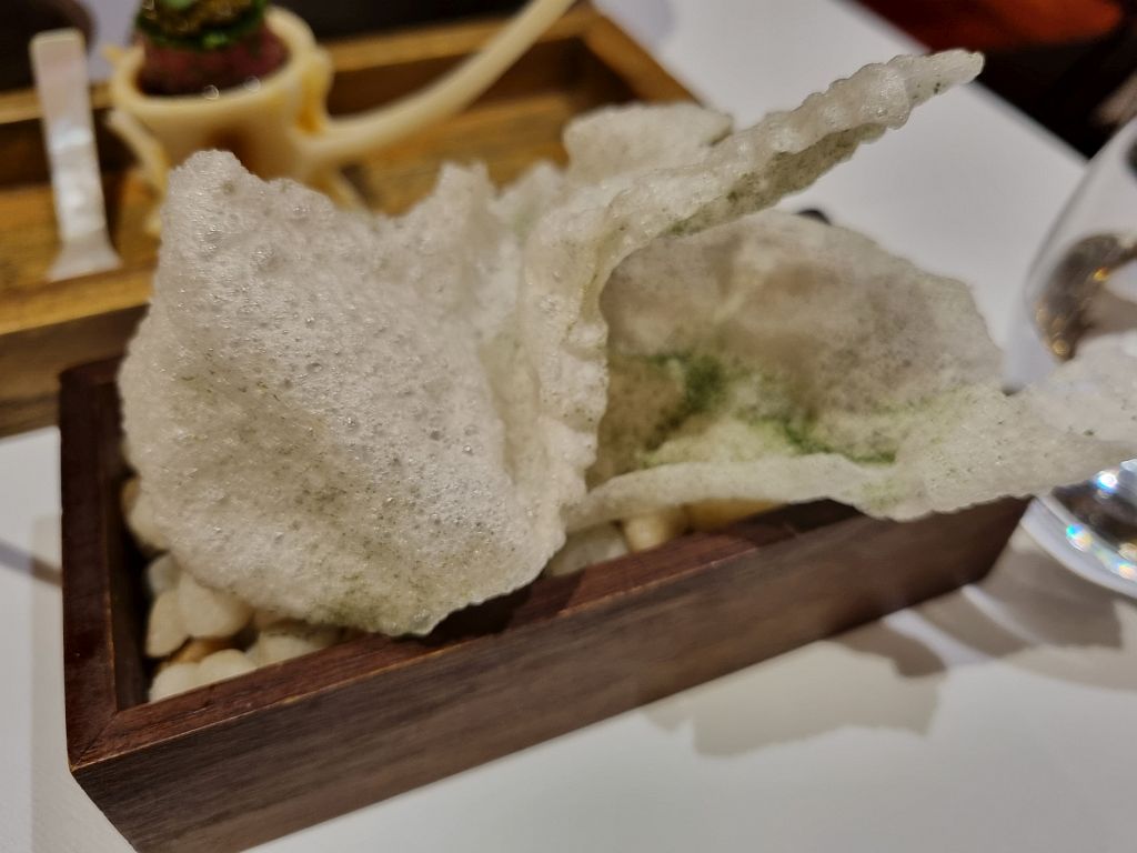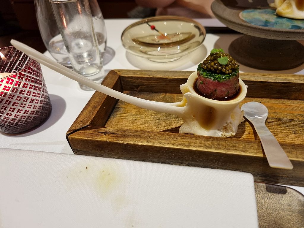 Der freundliche Service nahm uns die Jacken ab und geleitete uns zu einem Zweiertisch, leider umrandet von zwei weiteren Tischen, was im Laufe des Abends noch etwas nervig werden sollte. Beide Tische brillierten mit nervigen Gesprächsthemen und vor allem auch einem schon recht versnobten Gehabe, gerade gegenüber dem Service. Beispiel gefällig? „Ach, Wagyu haben wir ja so oft, da wollen wir heute mal was anderes probieren ..“