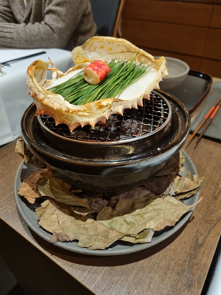 Im Menü ging es dann für Meike los mit einem Spezialgang. Im Nagaya gibt es keine Zusatzgänge, sondern man kann quasi einzelne Gänge „upgraden“. Meike hat sich entschieden bei der Vorspeise eine Königskrabbe zu nehmen, die am Tisch auf diesem kleinen Grill erwärmt wurde.