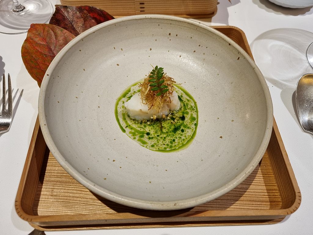 Der Fisch des Monats, wieder Kabeljau, kam als nächstes. Dazu eine Buttermilch-Dashi die so vollmundig und mit einem Schnittlauchöl abgerundet daher kam, dass man mal wieder die Finger nutzen wollte, um jeden Tropfen aufzusaugen.