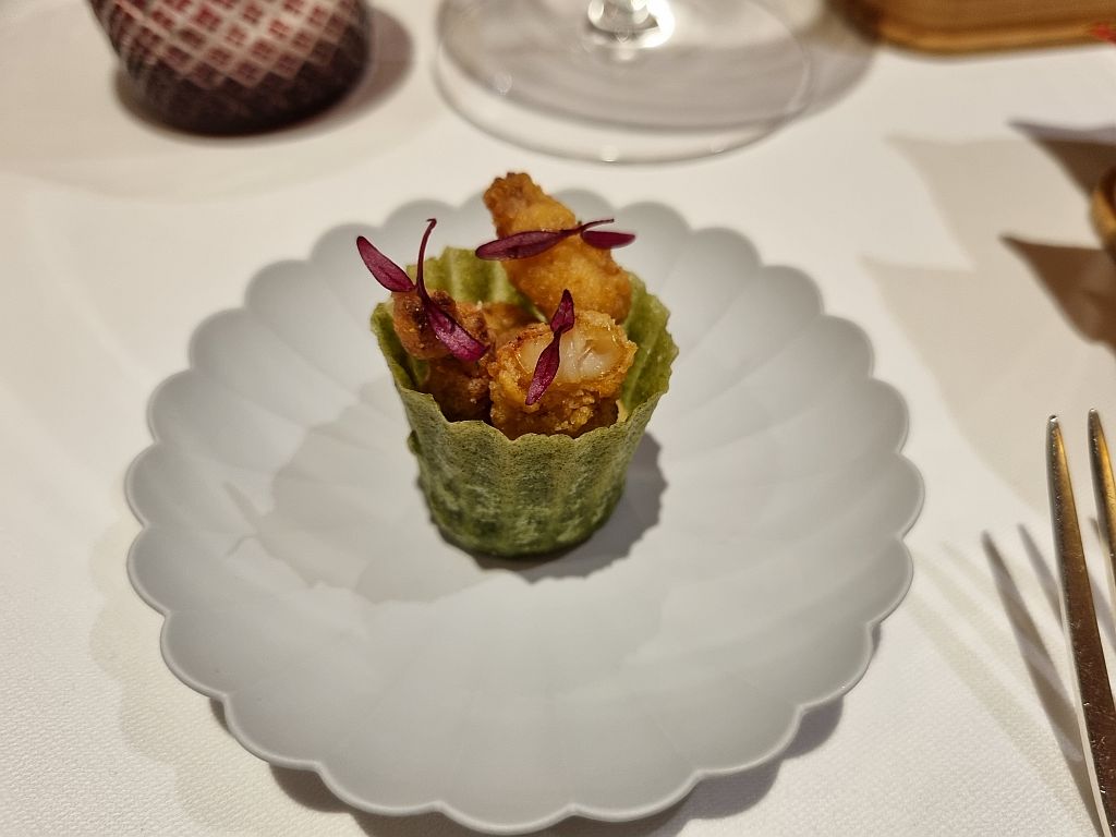 Bei Meike dagegen puristisch die Königskrabbe einmal als Tempura und einmal mit Dashi. Beides hervorragend und sehr auf das Produkt „Königskrabbe“ fokussiert.