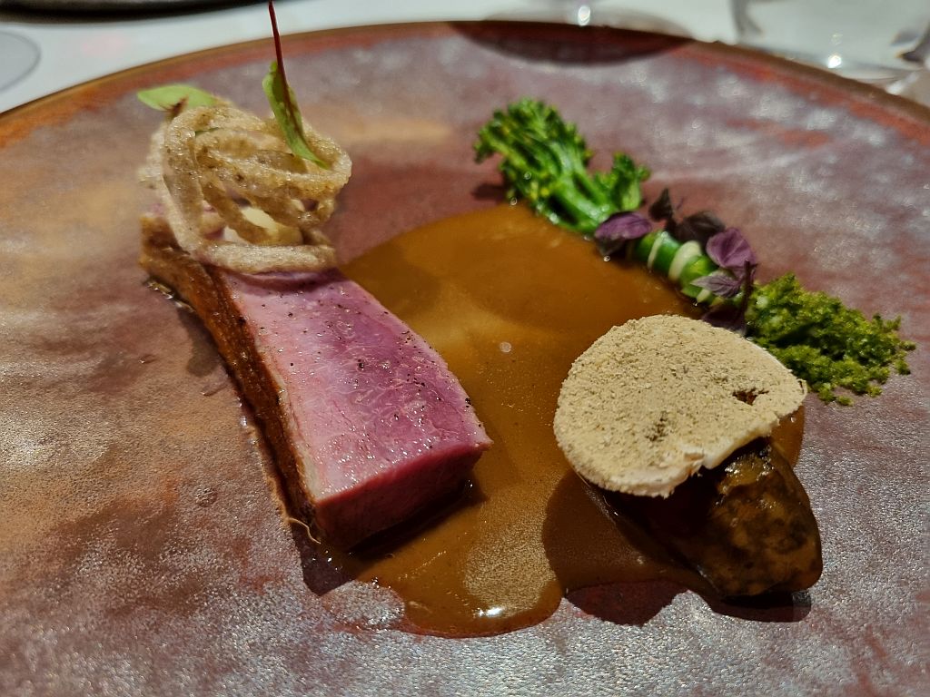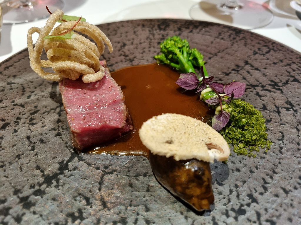 Zeit für den Hauptgang. Und hier gönnte sich Jens ein Upgrade auf Wagyu. Dazu Baby-Brokkoli, etwas Majonnaise, Pilz Duxelles in einer kleinen Gel-Nocke, eine sehr gute Sauce und etwas, was wir nicht gleich erkannten. Was uns aber sehr faszinierte, denn das zuerst als „Kartoffelstroh, nur anders“ bezeichnete Ding auf dem Fleisch waren sehr leicht frittierte Udon. Und die passten sowas von gut zum Fleisch!