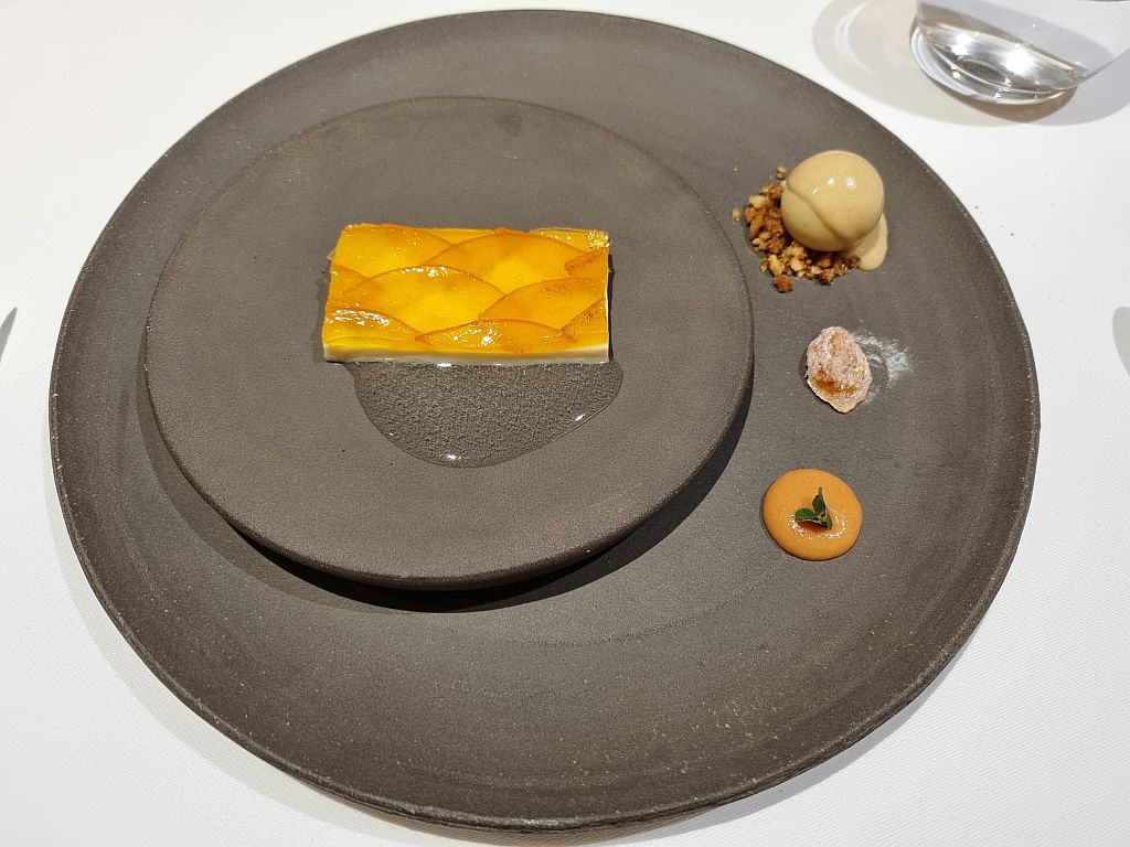 Ein kleines Küchlein mit Aprikose, dazu ein kleines Sesameis, ein Fruchtgummi und eine Creme. Wir waren zu diesem Zeitpunkt schon sehr satt, sodass wir leider auch hier nicht mehr mehr Details wissen. Aber es war hervorragend und die Begeisterung fühlen wir heute noch.