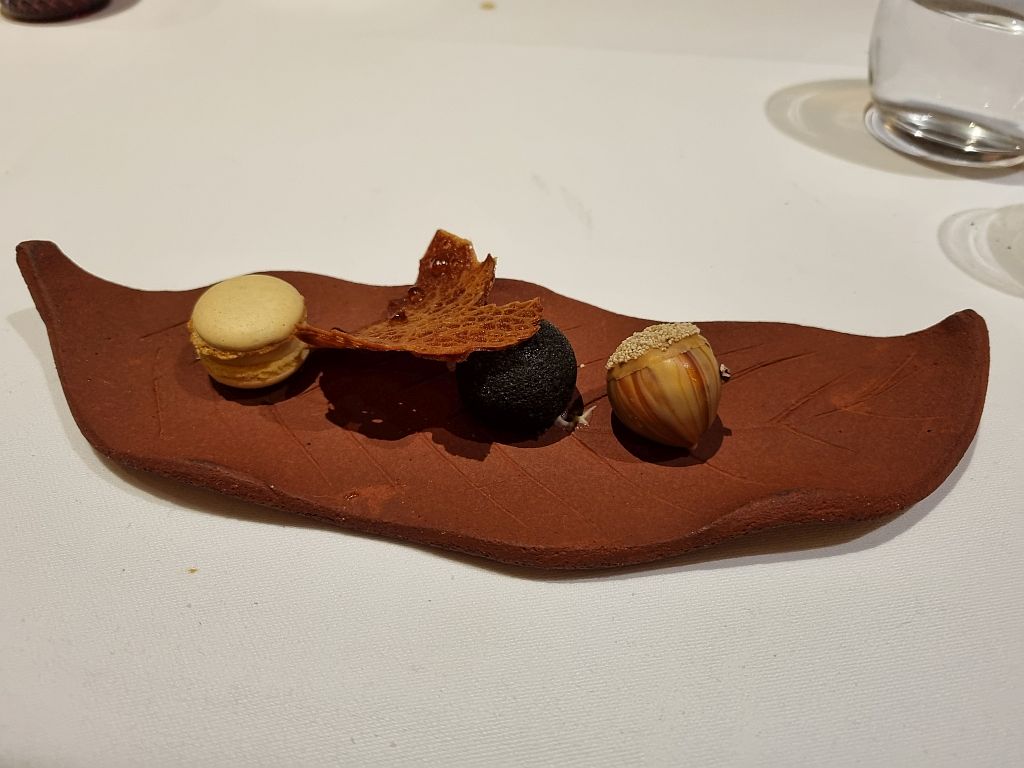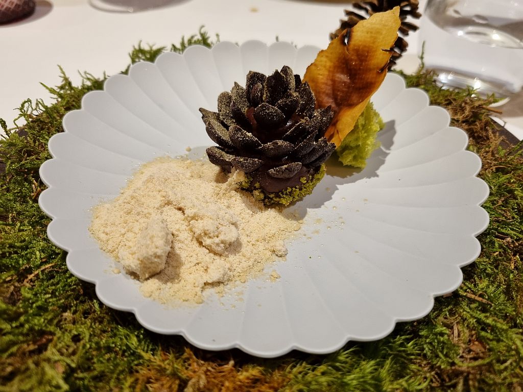 Den die schönen Teller endeten nicht, auch nicht beim zweiten Dessert: Ein aus Schokolade bestehender „Tannenzapfen“, eine Hippe als Blatt und ein Eis. Ja genau, das bröselige im Vordergrund ist Eis – beeindruckend.