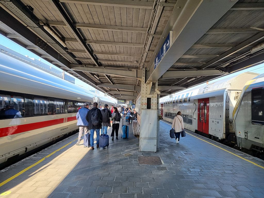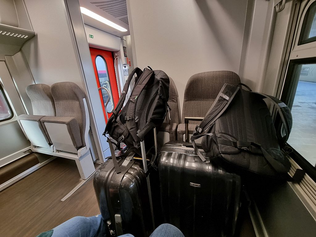 Eisenbahn in Belgien: Immer noch sehr cool. Zum Beispiel gibt es (wie in Schweden, siehe unsere Reise von Bornholm nach Kopenhagen via Ystad) einen Platz, wo man mit seinen Koffern sitzen kann.