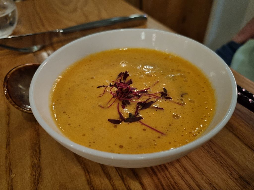 Im Restaurant wurden wir freundlich empfangen und an einen Tisch etwa in der Mitte des Raumes platziert. Hinter Meike war ein Fenster, durch das wir in das Nachbarrestaurant schauen konnten. Wo sich zur Mitte unseres Essens eine 8-köpfige Damenrunde platzierte und so laut redete, dass wir es hören konnten.