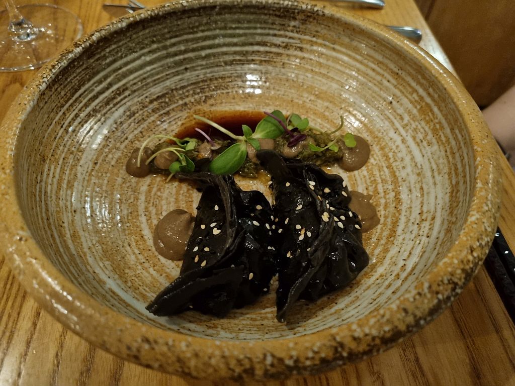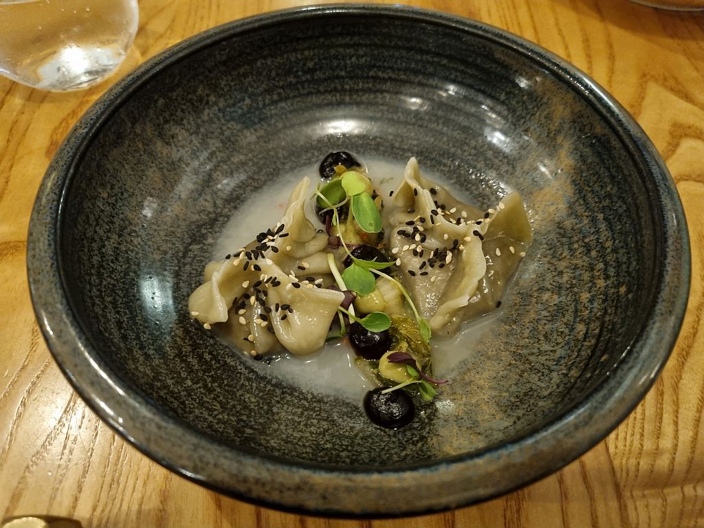 Für den zweiten Gang hatten wir uns für zwei unterschiedliche Gyozas entschieden. Meike hatte Hühnchen mit einem Tomatensud, weißen Kimchi und Basilikum. Der Teig war etwas trocken und die Gyozas daher auch leider nicht besonders gut.