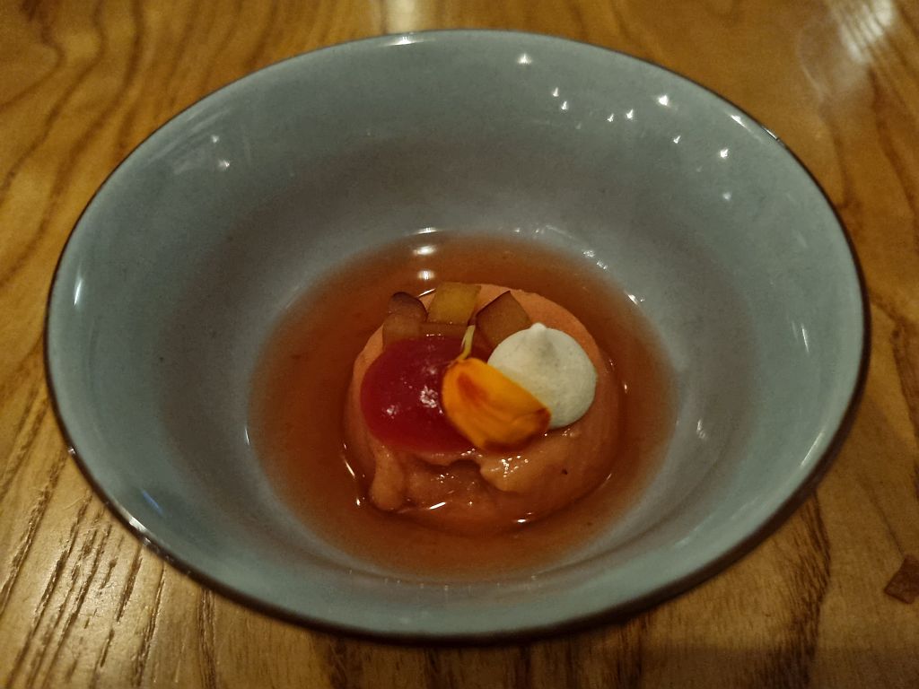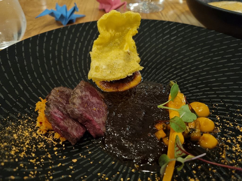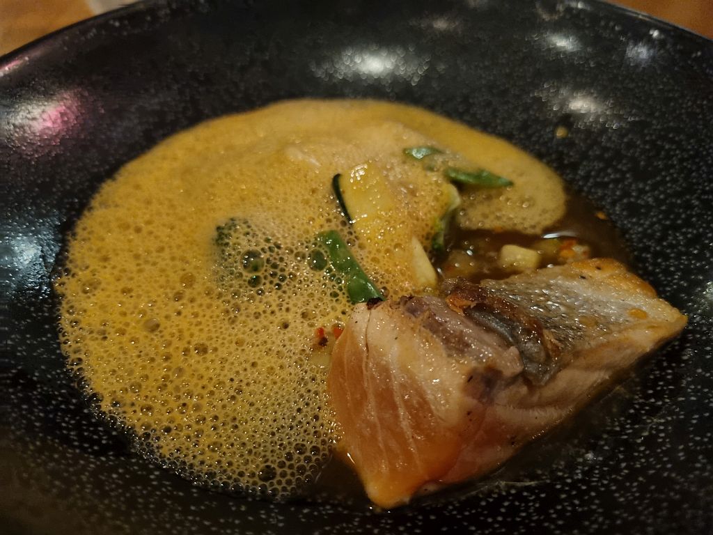 Meike hatte einen Lachs mit sehr, sehr weichen Udon, Mais, sehr intensiven Chilies und einem Miso Dashi Schaum. Das war wiederum gut gemacht, sogar die Haut war lecker.
