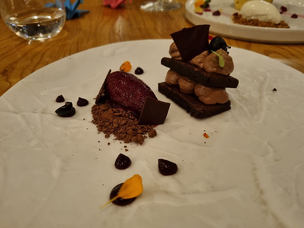 Für Jens dann als Nachtisch die volle Dröhnung Schokolade! Dunkle Schokolade in verschiedenen Formen und Texturen, Blaubeeren-Sorbet und Minze – sehr klassisch und wirklich gut.
