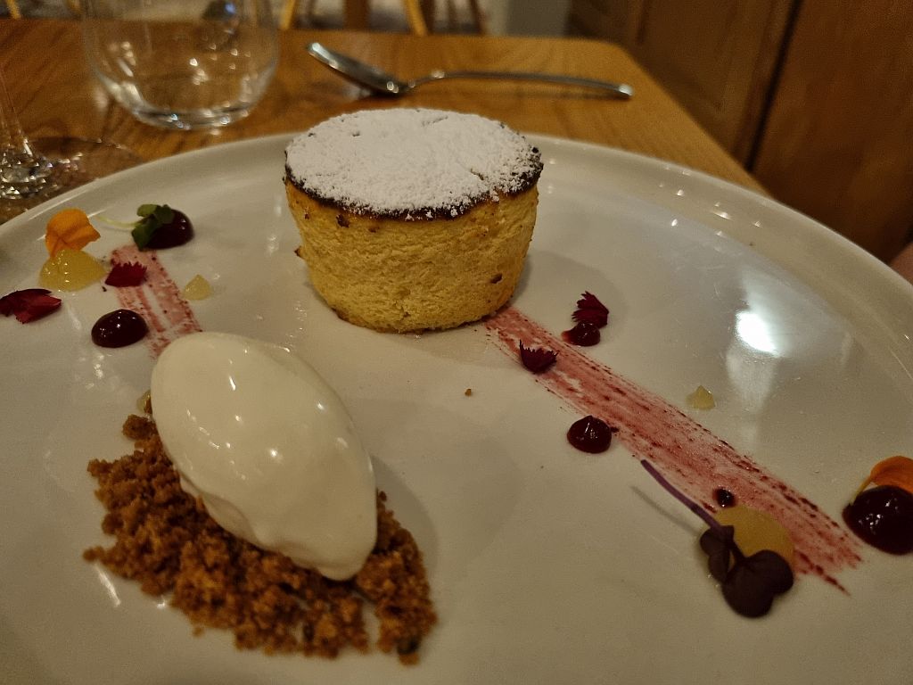 Und Meike gönnte sich ein kleines Stück „Japanese cheesecake“ mit Kirsche, Yuzu, Mandel und einer Creme aus Sake und Vanille.