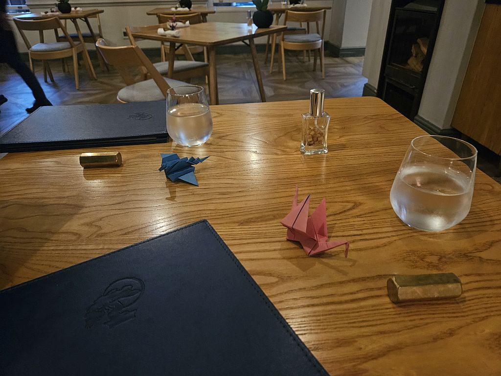 Der Tisch war nett eingerichtet mit kleinen gefalteten Kranichen und Stäbchen.