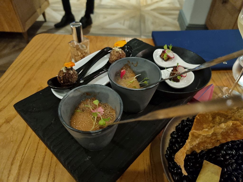 Mehr Kleinigkeiten in Form zweier Fleisch-Pralinen (leider nicht gemerkt, was für ein Fleisch das war), ein leckeres Stück Schweinebauch aufgespießt im Vordergrund und ein Stück eingelegter Tofu auf den weißen Löffeln rechts.