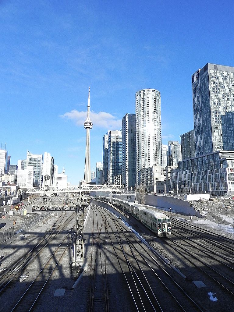 Vorab mussten wir uns aber zu dem Treffpunkt der Tour durchschlagen, was ein nicht so einfaches Unterfangen wurde, da wir uns mir der amerikanischen Einteilung von Streets und Avenues doch etwas schwer getan haben. Um so mehr, als das die Kanadier Strassen und Avenues mittendrin anfangen bzw. enden lassen. In der irrigen Annahme, dass wir „ja noch viel Zeit haben“, sind wir noch einen kleinen Umweg gefahren, um noch einige schöne Perspektiven von Toronto einzufangen. Im Idealfall mit Eisenbahnen darin.