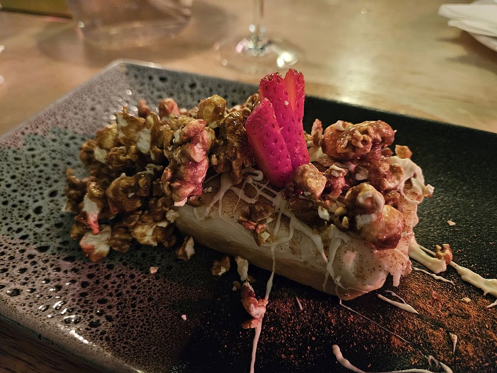 Die gestern war besser – hier war viel mehr Chips und Reis dabei, weniger Seafood. Aber es war trotzdem lecker und füllend. Aber nicht so füllend, dass nicht noch eine „Melktart with salted caramel popcorn“ drin gewesen wäre.