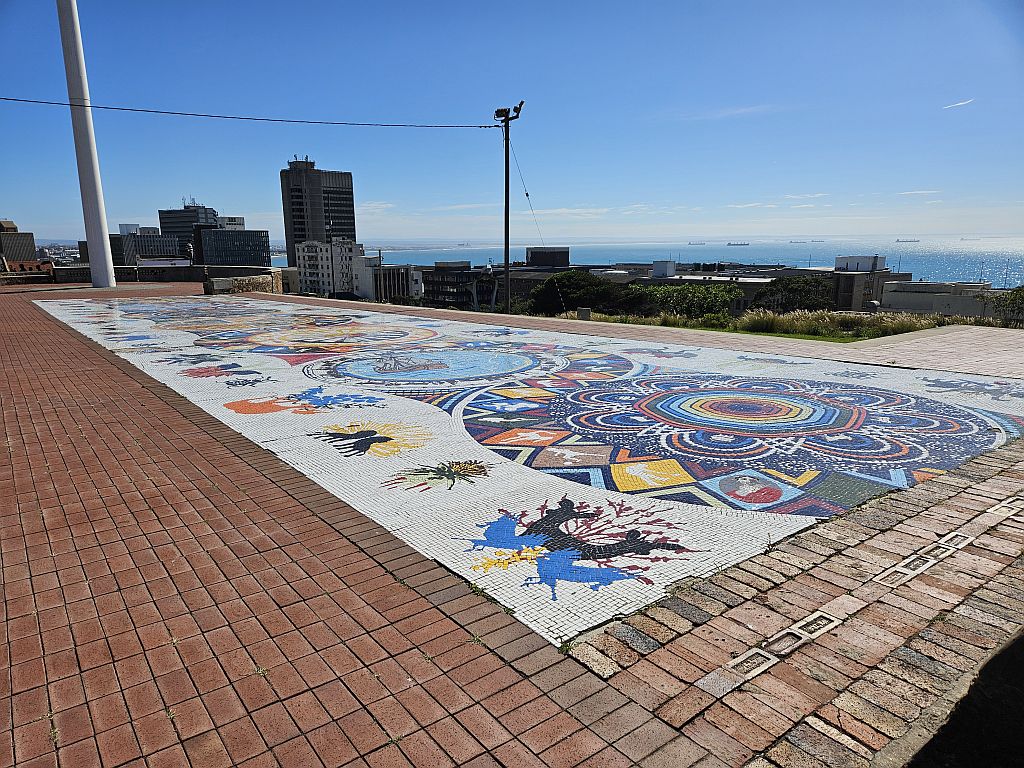 Auf dem Boden liegt ein schönes Mosaik mit traditionellen und aktuellen Darstellungen des Lebens in P.E. – Teile waren davon leider etwas in Mitleidenschaft gezogen worden, aber hier bekam man einen schönen Überblick über die Facetten der Stadt.