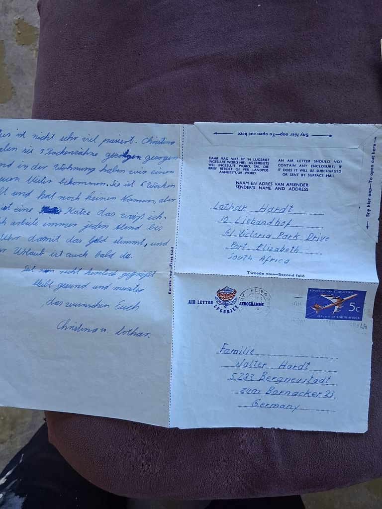 Viele Briefe zeigen, wie eng und doch wie weit die Verbindung nach Deutschland war. Hier ein Brief von Jens Vater an seine Eltern in Bergneustadt. Viele Briefe, Pakete und Tonbänder gingen auf der Reise verloren, etwas, was auch heute noch ein Problem bei Postkarten ist. Damals aber eher der Infrastruktur geschuldet, heute eher der Korruption.