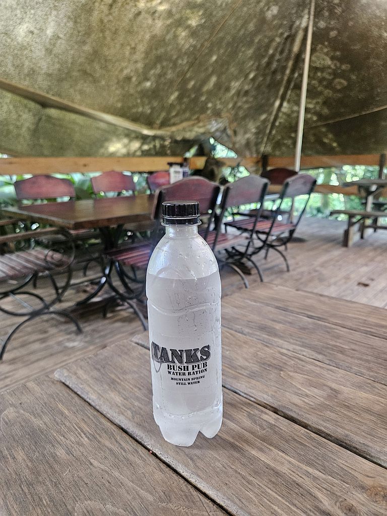 Tanks Bush Pub ist ein thematisch sehr militärisch angehauchter Pub im Busch. Soweit also genau das, was der Name verspricht. Zwischen Macadamia und Mango Bäumen steht ein kleines Gebäude mit einem riesigen Tarnzelt darüber. An den Wänden viel Militär-Krams und als wir ankamen wurden wir von einem langhaarigen Local gleich in Empfang genommen und gefragt, ob wir auch was Essen wollen würden. Trinken wird hier anscheinend vorausgesetzt.