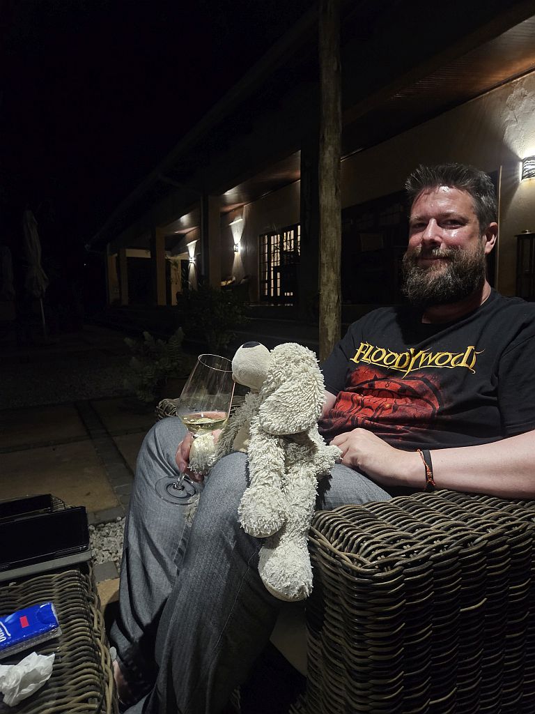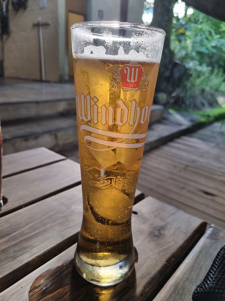 Meike erklärte sich bereit die letzten Kilometer bis zur Guest Lodge zu fahren, also konnte Jens das frisch gezapfte Windhoek Lager genießen. Was erstaunlich lecker war.