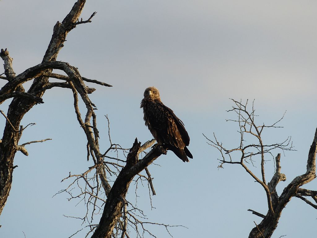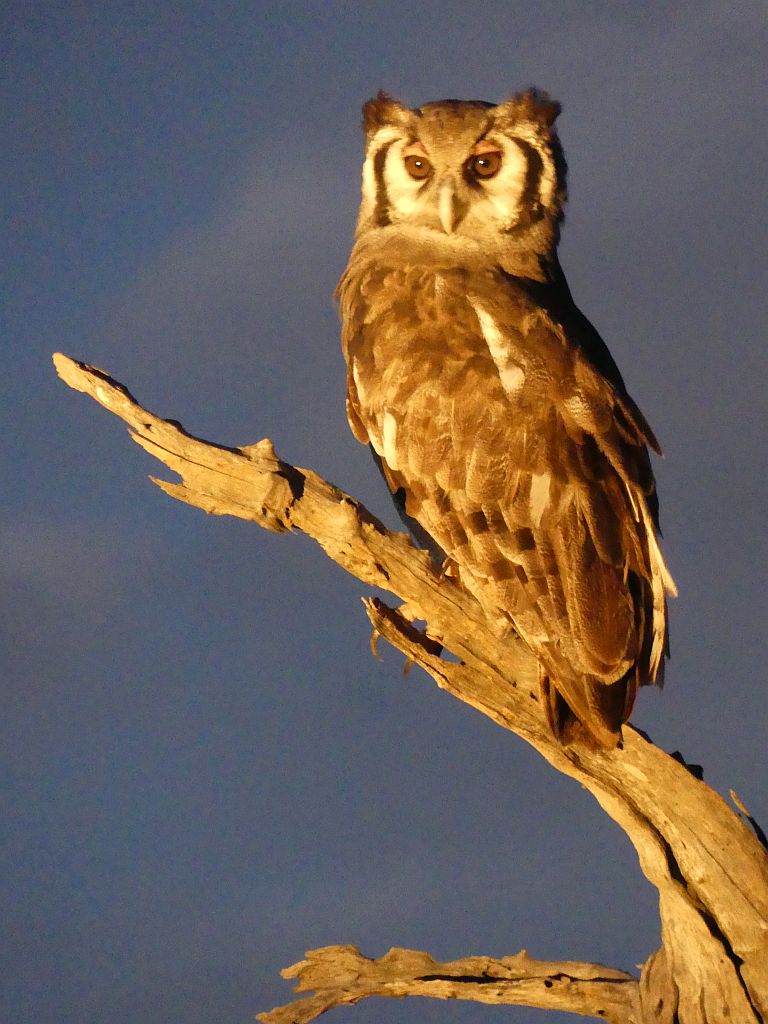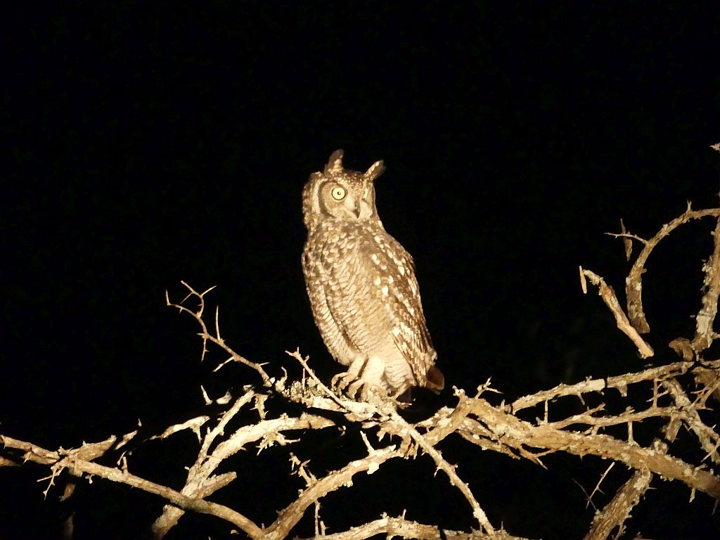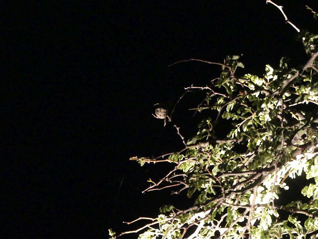 Eine Eule in der Dämmerung war dann die nächste Sichtung, sobald es dunkel wird, werden mit dem Suchscheinwerfer übrigens nur noch nachtaktive Tiere angestahlt. Tagaktive Tiere würden dadurch eine Weile blind und damit leichte Beute sein, das hier war immer noch die Wildnis.