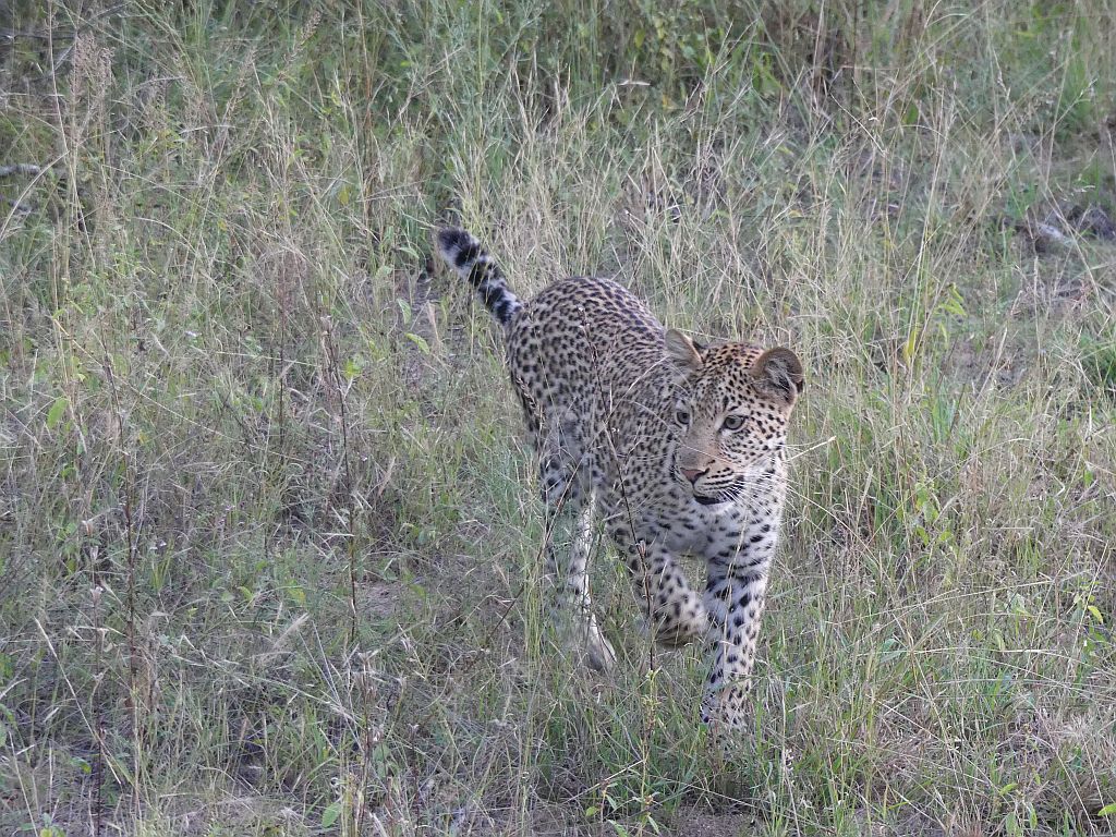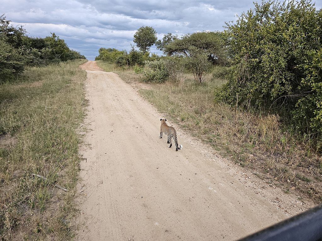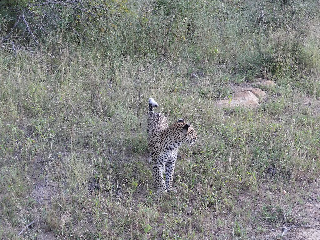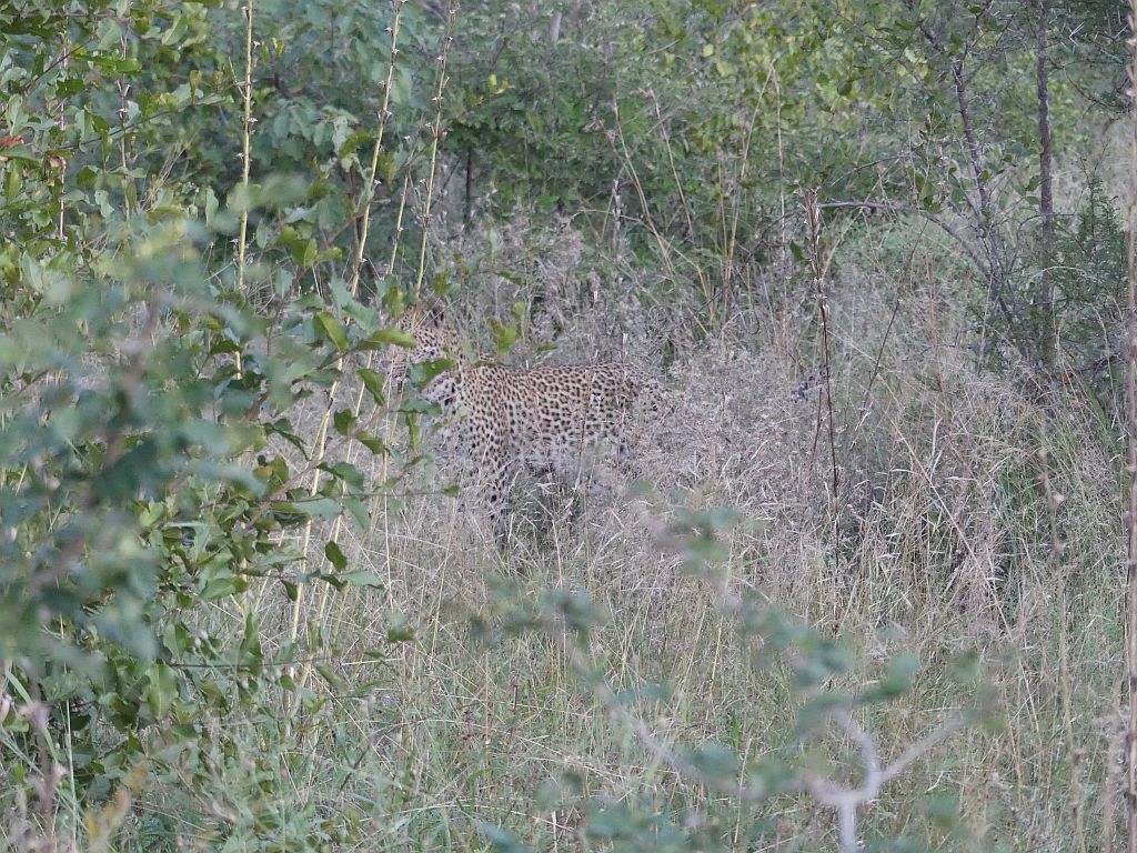 Ach ja, das Thema „Leopard“. Wie gesagt waren ja unsere Mitreisenden schon ein paar Tage hier und haben keinen Leopard gesehen. Und das ein paar Mal beklagt. Und auf einmal meinte Thabo: „Leopard! Left!“