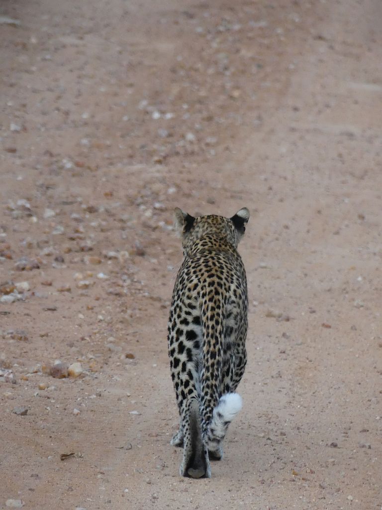 Der Leopard wird etwa 90 bis 190 Zentimeter lang, den etwa 65 bis 100 Zentimeter langen Schwanz nicht mitgerechnet. In Südafrika kommen relativ kleine Leoparden vor, Weibchen wiegen hier durchschnittlich nur etwa 21 Kilogramm und Männchen etwa 31 Kilogramm. Und das hier war eine recht junge Dame, wie uns Daniel nachher erzählte.