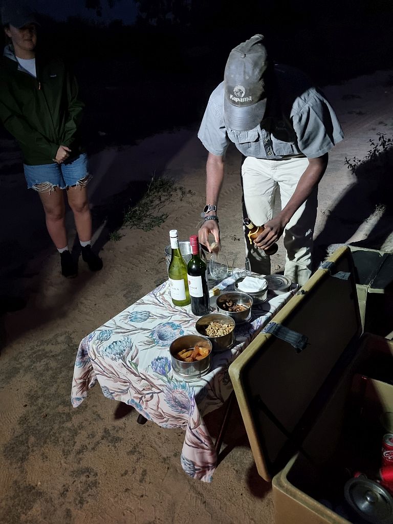 Eine Pause in der Dämmerung gab es auch, wo wir neben ein bisschen Biltong auch zwischen Wasser, Softdrinks, Wein, G&T oder Amarula wählen konnten. Normalerweise wird das ganze so etwa in der Hälfte des Game Drives aufgetischt wenn es noch heller ist, aber durch die Leoparden-Dame war die Zeitplanung etwas geändert worden.