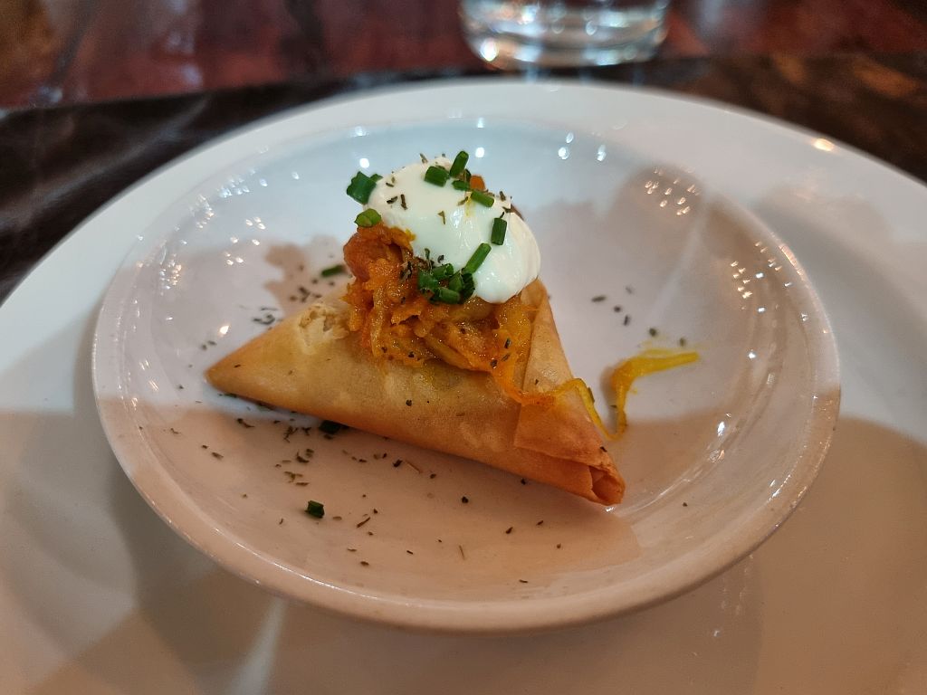 Eine kleine Teigtasche mit einer recht würzigen Hackfleisch-Füllung – das brachte schon einmal das Fleisch-Thema gut zur Geltung. Denn das Restaurant ist bekannt für seine gute Weinkarte und eben die auf offener Flamme gegrillte Steaks.