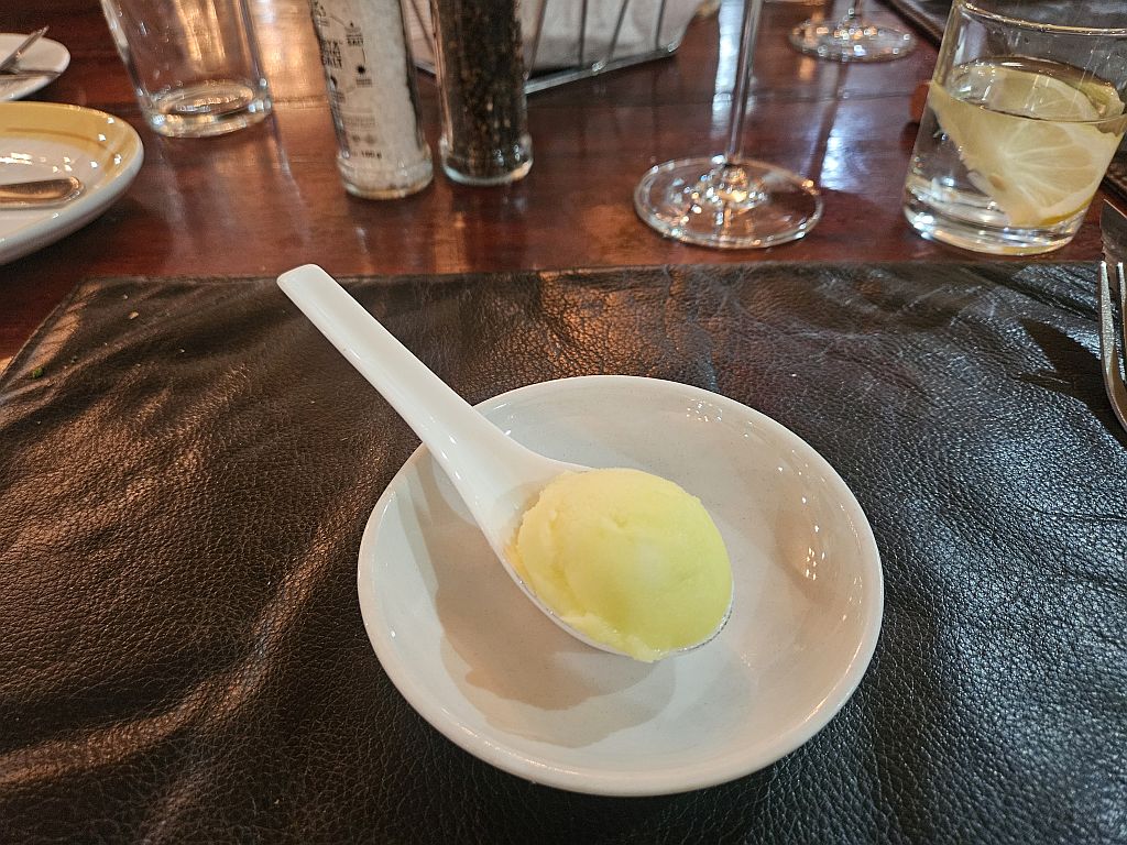 Ein kleiner Geschmacks-Neutralisator kam danach an den Tisch. In der Zwischenzeit hatten wir aber auch schon die erste Flasche Wein geleert und überlegten an einer zweiten. Und bestellten dann auch eine auf Empfehlung unseres „A-One“-Kellners (insider Witz).