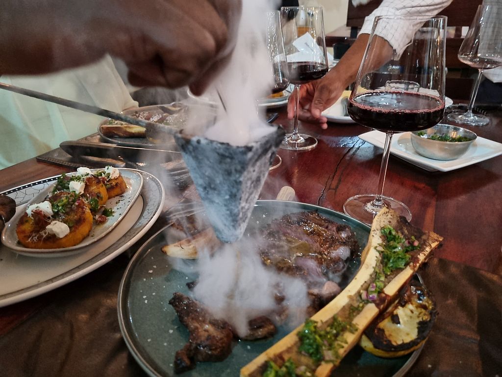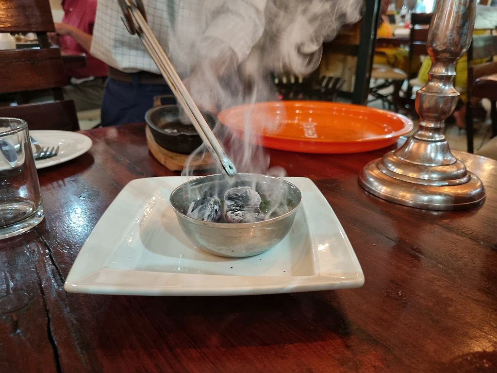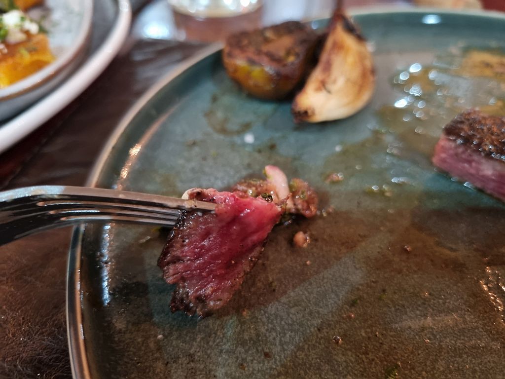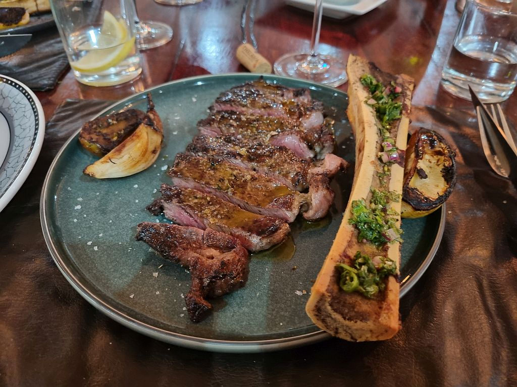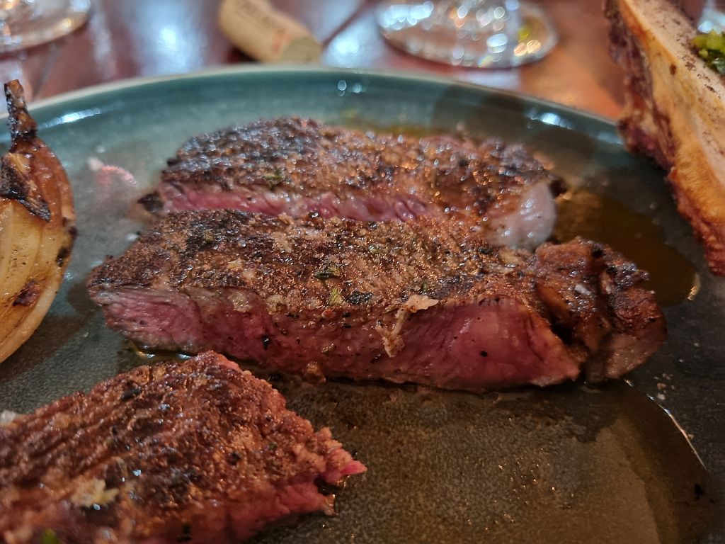 Damit war aber nicht genug Rauch (unsere Klamotten kamen danach direkt in den Wäschesack und wurden in Deutschland direkt als erstes gewaschen), denn dann kamen unsere Steaks. Und über die wurde mit dieser Markknochen-Feuerschale, die in der Glut erhitzt wird, Knochenmark vom Rind gegeben. Sieht spannend aus und gibt tatsächlich noch einen kleinen Kick zu dem eh schon hervorragenden Fleisch.