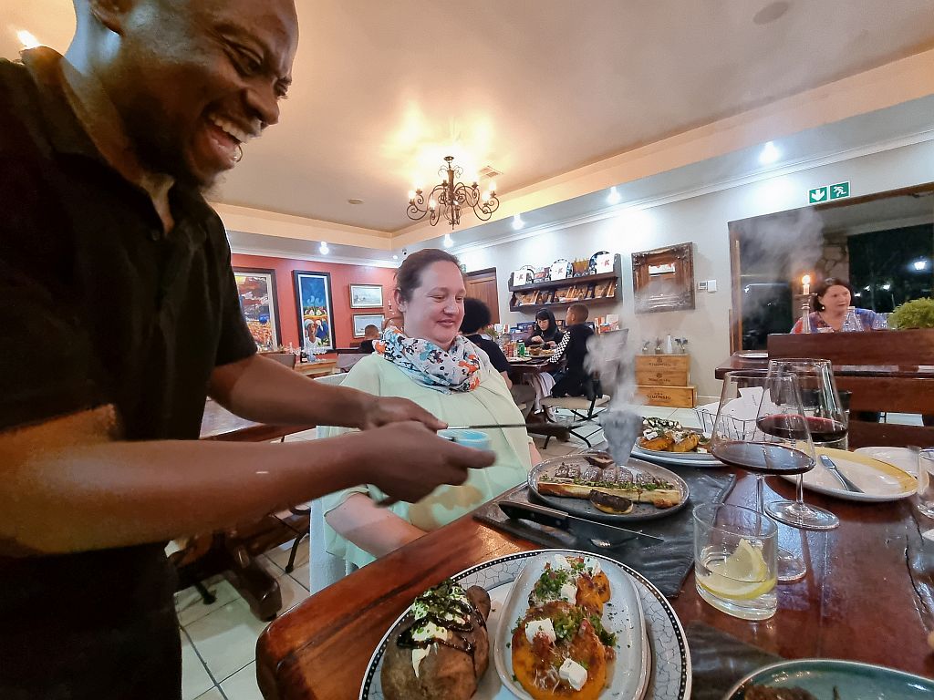 Die Einrichtung war etwas chaotisch und eine Mischung aus afrikanischer Gallerie, einem Weinladen und einem einfachen Steakhaus mit Gartenmöbeln. Aber am Ende passte es sehr gut zu dem aktiven und super freundlichen Service und dem Essen.