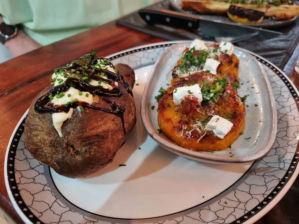 Die Beilagen, die wir auch noch jeder bekamen, waren sehr, sehr überflüssig. Von den kleinen Kürbisküchlein haben wir jeder nur eines Essen können. Bei der Kartoffel kamen zwei Bissen weg, der Rest war einfach zu viel.