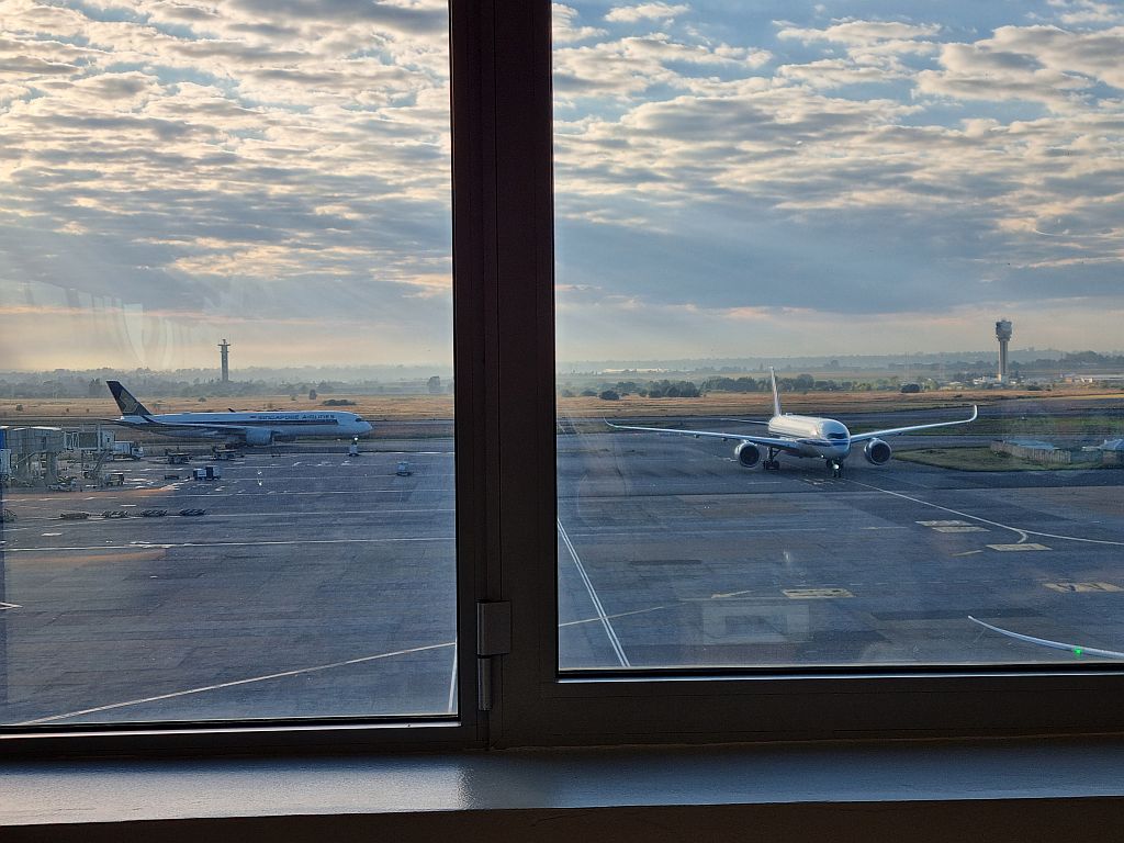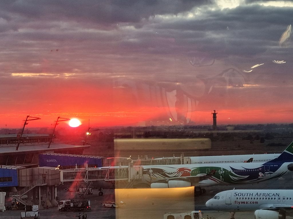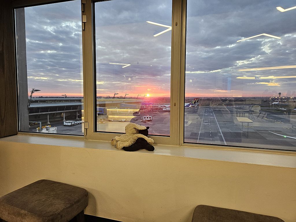 Es war wirklich sehr früh, was aber den Vorteil hatte, dass wir an der Security sehr schnell durch waren und dann auch gleich aus Südafrika ausreisen konnten. Schon standen wir im Abflug-Terminal und überlegten, was wir machen.