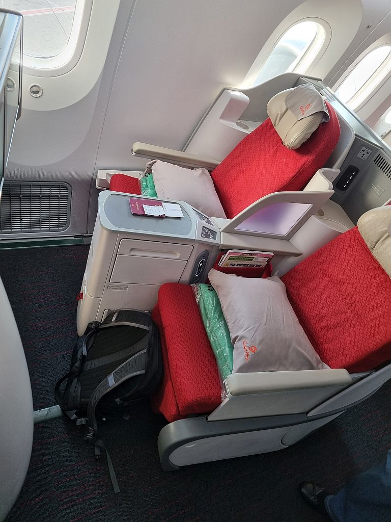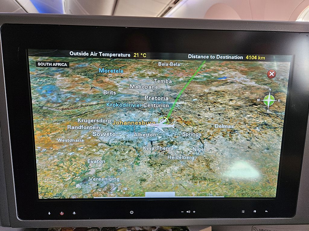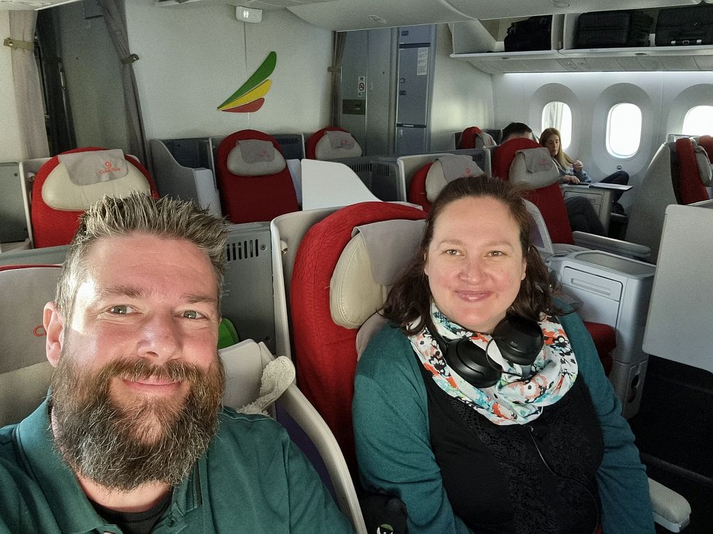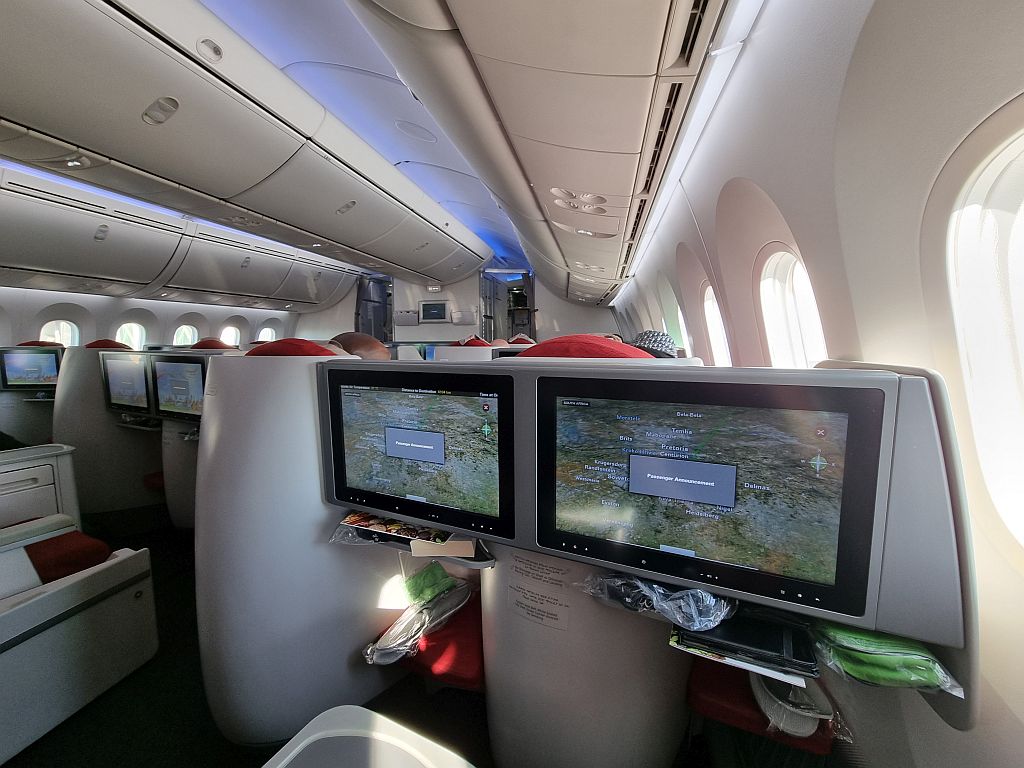 Die 787-900 gibt es bei Ethiopian in 2 Ausfertigungen. Einmal wo die Business Class in einer 1-2-1 Konfiguration ist, so wie auf dem Hinflug von Addis Ababa nach Kapstadt. Und einmal wo die Business Class in einer 2-2-2 Konfiguration ist, so wie jetzt. Die Sitze vom Typ Collins Aerospace Diamond (im Gegensatz zu dem Collins Aerospace Super Diamond bei der 1-2-1 Konfig) finden wir sehr bequem und sie haben noch einen riesen Vorteil gegenüber denen im A350 von Ethiopean: Staufächer!
